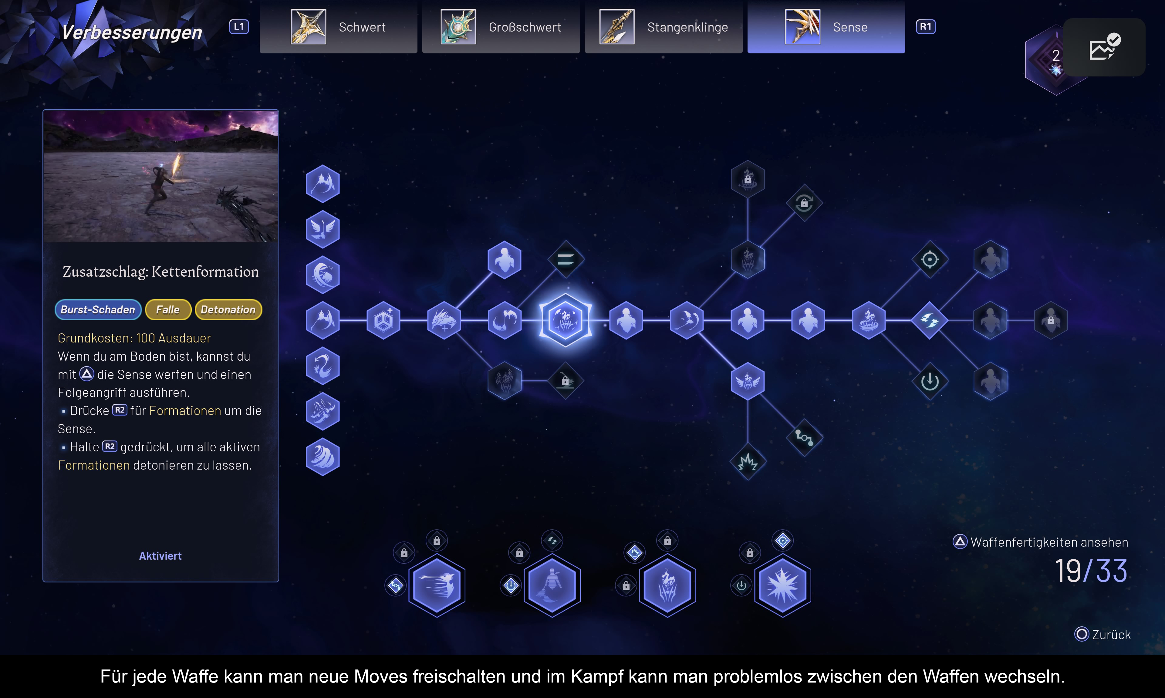 „Lost Soul Aside“ ist ein Actionspiel mit leichten RPG-Anleihen. Die Vielfalt des Spiels zeigt sich in den vier verschiedenen Waffen, den unterschiedlichen Tränken und Amuletten. Die Elixiere dienen der Auffüllung von Gesundheit und Ausdauer, während Schmuckstücke die Attribute des Kaisers verbessern. Die verfügbaren Waffen (Schwert, Großschwert, Stangenklinge und Sense) können individuell aufgewertet und mit neuen Manövern erweitert werden. Dazu setzt man die Seelenpunkte ein, die man von besiegten Voidrax automatisch sammelt. Ebenfalls lassen sich die Waffen mit zusätzlichen Talismanen in Kernfertigkeiten wie Brechen oder Kritischer Schaden aufmotzen – dazu stehen 10 Slots pro Waffe zur Verfügung. Zudem gibt es verschiedene Ausführungen, die auch noch spezifischen Elementarschaden verursachen. Hier kann man recht frei herumexperimentieren, wobei die Sense definitiv alle anderen Waffen überstrahlt – sprich zu stark ist. Ansonsten verlangen die vielen Kämpfe auch noch nach Blocken und Ausweichen – was wiederum Ausdauer frisst, genauso wie Spezialaktionen. Deshalb sollte man immer den Balken im Auge behalten. Und dann gibt es noch Lord Arenas Kräfte, von denen man bis zu drei permanent anlegen kann, sowie einen Verwandlungsmodus. Am Ende stellt sich aber heraus: Einen wirklichen Unterschied machen diese Kräfte nicht, eher im Gegenteil, die fallen viel zu schwach aus, vor allem da viele Gegner neben einer Barriere auch noch mehrere Lebensbalken besitzen. Kämpfe ziehen sich dadurch mitunter ganz schön in die Länge! Was ebenfalls stört, sind die vielen (und langen) Phasen, in denen man den Gegnern nur ausweichen muss, aber keinen Schaden anrichtet. Dazu gesellen sich noch eine unausgereifte Flugsequenz am Ende und nervige Surf-Sequenzen auf dem Schwert ist weder das eine noch das andere.