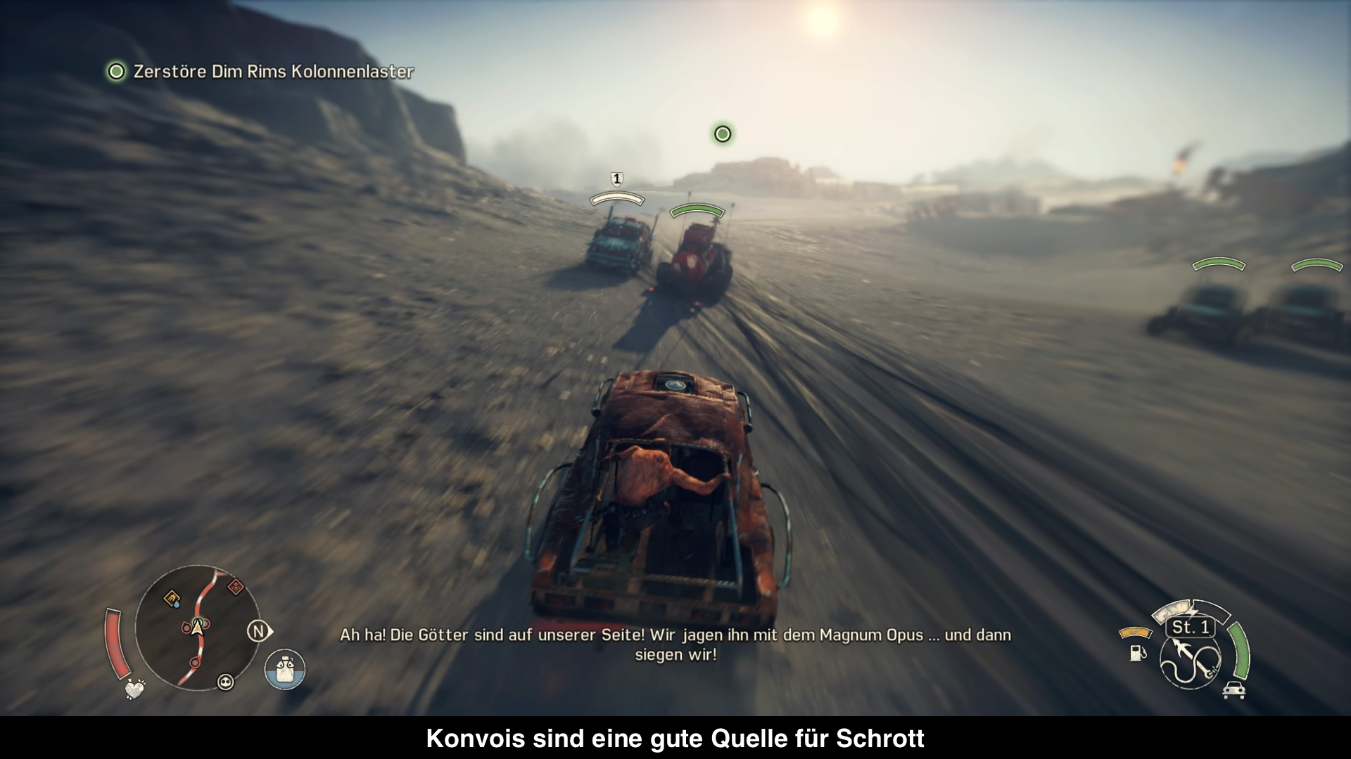 Spielerisch bekommt man mit Mad Max mal wieder ein Open World Spiel serviert. Ihr fahrt durch die post-apokalyptische Wüste mit Chumbucket und müsst für diverse Leute Gefallen tun, damit ihr selber eurem Ziel näher kommt. Dabei trifft man regelmäßig auf Scrotus Schergen, die euch ans Leder wollen. Kommt es zum Kampf könnt ihr euch auf eure Fäuste verlassen. Dabei erinnert das Kampfsystem erschreckend stark an Rocksteadys Batman Serie oder Mittelerde: Mordors Schatten. Mit Quadrat greift ihr also an und mit Dreieck werden Angriffe gekontert. Was einfach klingt, ist gar nicht so einfach, denn man muss den richtigen „Rhythmus“ im Kampf finden, um erfolgreich zu bleiben. Glücklicherweise könnt ihr auf Äxte oder eure Schrotflinte zurückgreifen, wenn es brenzlig werden sollte, jedoch ist Munition selten und ihr solltet euch gut überlegen, wann ihr sie einsetzen wollt. Wirklich nervig hierbei ist die Kamera, die vor allem in engeren Räumen eher hinderlich ist. Denn gerne werden angreifende Gegner aus dem Sichtfeld genommen und so hat man keine Chance zum Kontern. Übrigens trefft ihr auf Gegner nicht nur zu Fuß, sondern auch im Fahrzeug. Denn immer wieder trefft ihr auf Konvois auf den Straßen, die euch direkt angreifen werden. Dann könnt ihr euch zur Wehr setzen und während der Fahrt gegen sie kämpfen. Mit einer Harpune könnt ihr beispielsweise Türen herausreißen oder explodierende Stäbe auf sie werfen. Es ist aber auch möglich euer Fahrzeug zu tunen, damit es mit fiesen Stacheln oder anderen fiesen Gimmicks ausgestattet wird, die euch im Kampf helfen. Bis ihr aber wirklich stark seid, vergeht einiges an Zeit, denn für jedes Power-Up fürs Auto oder Max braucht ihr Schrott, der überall in der Welt verstreut ist. Leider ist er aber trotzdem noch so selten, dass es sehr lange dauert bis man einmal stark genug ist, um es mit mehreren Gegnern aufzunehmen oder das Fahrzeug vernünftig auf der Straße zu halten. Denn das Handling der Fahrzeuge ist insbesondere zu Beginn der Geschichte sehr schwammig und man bleibt gerne mal an diversen Gegenständen hängen. Ansonsten gibt es in der Welt einiges zu tun, denn neben den Haupt- und Nebenmissionen gibt es auch zahlreiche Collectibles, wie Türme die ihr zerstören müsst, Lager zum Ausräumen oder Ruinen zum Durchsuchen. Leider bieten die alle wenig Abwechslung und werden irgendwann etwas langweilig.