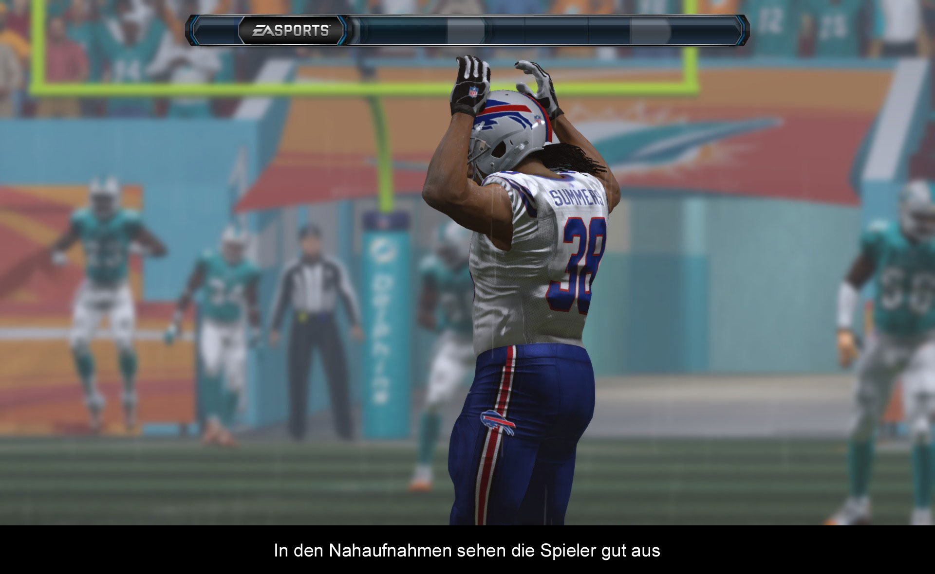Die Kombination aus Madden und Next Gen erinnert Football Enthusiasten oftmals an das legendäre Madden-Teaser Video, welches EA damals vor dem Release der PS3 veröffentlicht hat. Und es spricht nicht gerade für EA, dass das damalige Video immer noch besser aussieht, als das was wir inzwischen auf der PS4 vorgesetzt bekommen. Gegenüber dem letztjährigen „Madden NFL 25“ überzeugt das Spiel jetzt durch eine saubere und flüssige Präsentation. Auch die Spieler wirken teilweise gut modelliert. Nichtdestotrotz kommt man einfach nicht von dem Gedanken los, dass der finale Schritt Richtung Next Gen immer noch nicht getätigt wurden. Obwohl die Stadien gut animiert sind, sehen die Fans immer noch sehr hässlich und teilweise sogar pixelig aus. Und auch die einzelnen Animationen sind meist noch sehr hakelig und alles andere als flüssig. Ein großes Lob hingegen verdienen die Wetter-Effekte. Vor allem die Spiele im Schnee sind ein echter Hingucker. Dies liegt insbesondere daran, dass sich der hektische Spielverlauf auch auf das Spielfeld auswirkt (zum Beispiel durch die Anhäufung von Fußabdrücken). Schaut man jedoch auch hier etwas genauer hin, lässt sich feststellen, dass selbst die Wölbungen im Schnee bei genauer Betrachtung etwas pixelig und unsauber sind. Obwohl Madden keinesfalls hässlich ist, ist es mit Sicherheit noch nicht das, was man sich zu Beginn dieser Generation erwartet hat. Insbesondere wenn man sich an das Ingnite Engine Teaser-Video erinnert, welcher ähnlich wie der zu Beginn angesprochene PS3 Trailer, eine nicht ganz realistische Vorschau auf die Zukunft der Serie präsentierte. Immerhin überzeugen wenigstens die Kommentatoren durch ein gelungenes Zusammenspiel, wodurch man ein einwandfreies TV-Feeling serviert bekommt. Hinzu kommen interessante Einspieler und wilde Kamerafahrten. EA weiß halt, wie man eine Lizenz voll ausnutzt.