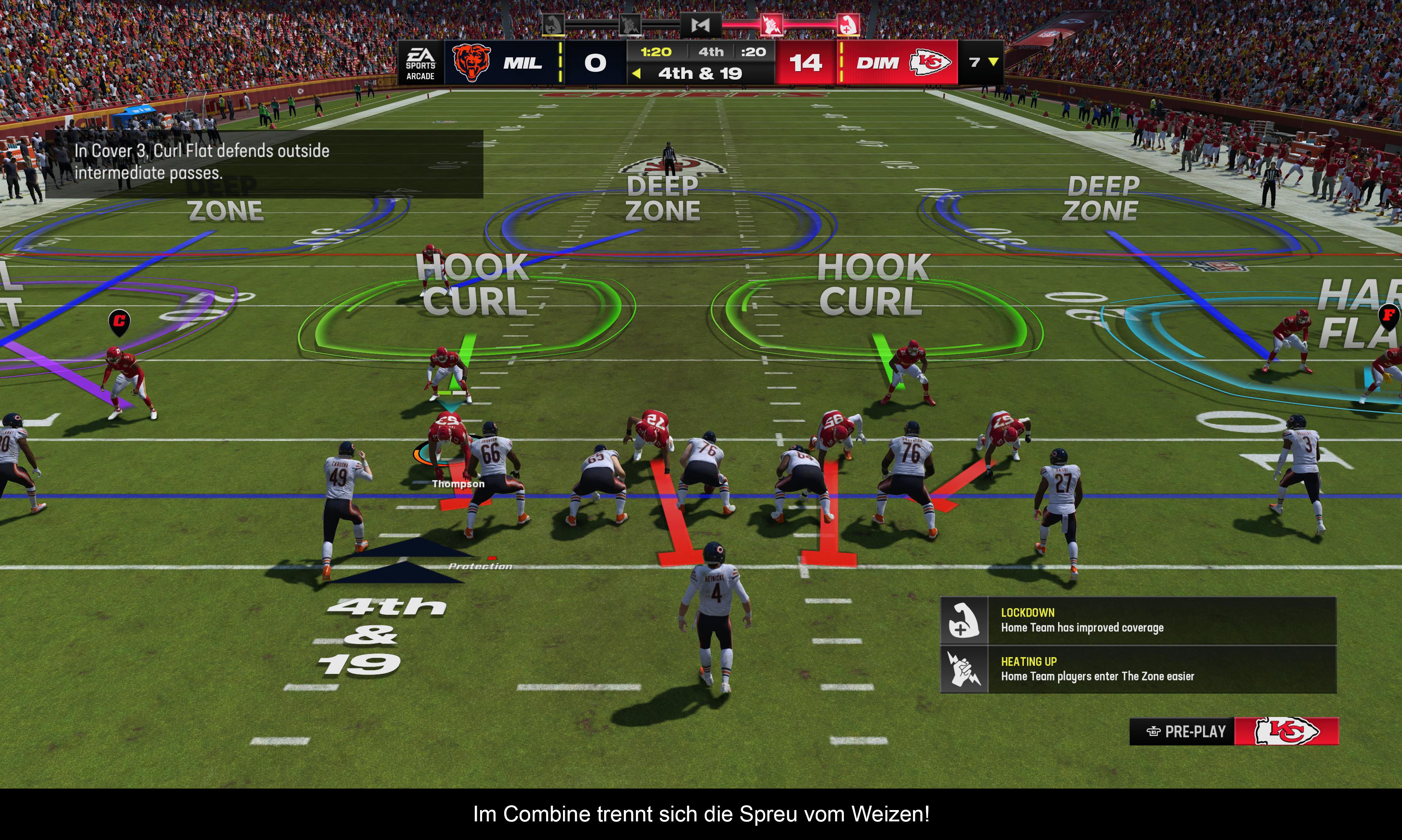 Und was das Gameplay angeht, lauten die diesjährigen Schlagwörter fieldSENSE & Character Technology. Im Grunde handelt es sich dabei um EAs eigene Animations-Engine, die jedem Spieler dabei hilft, anatomisch korrekte und realistische Bewegungen auszuführen. EA verspricht verbesserte Animationen in jederlei Hinsicht - egal ob für die Offensive oder für die Defensive. Und zugegebenermaßen wirken die Spieler enorm agil und lassen sich je nach individuellen Eigenschaften extrem gut und schnell über das Feld bewegen, während man mächtigen Tackles und sonstigen Angriffen aus dem Weg geht. Und obwohl ich kein Mitarbeiter von Digital Foundry bin, die technische Aspekte weitaus besser beschreiben können als ich - muss ich zugeben, dass Madden auf jeden Fall sehr rund und flüssig aussieht. Ab und zu treten zwar einige ClippingFfehler auf, aber angesichts der riesigen Menge an authentischen Animationen, lassen sich diese kleinen Mankos definitiv ertragen. Ein weiteres Feature, was mir sehr gefällt, sind die zahlreichen Einstellungsmöglichkeiten beim Gameplay. Da sicherlich nicht jeder alle Features von Madden auf Anhieb an verstehen wird, ist es umso erfreulicher zu sehen, dass man beispielsweise vorab auch einen simpleren Kontroll-Typ auswählen kann, der dem Spieler eine etwas einfachere und mehr Arcade-ähnliche Bedienung anbietet. Somit ist das Spiel nicht nur etwas für routinierte Profis, sondern auch frische Newcomer.