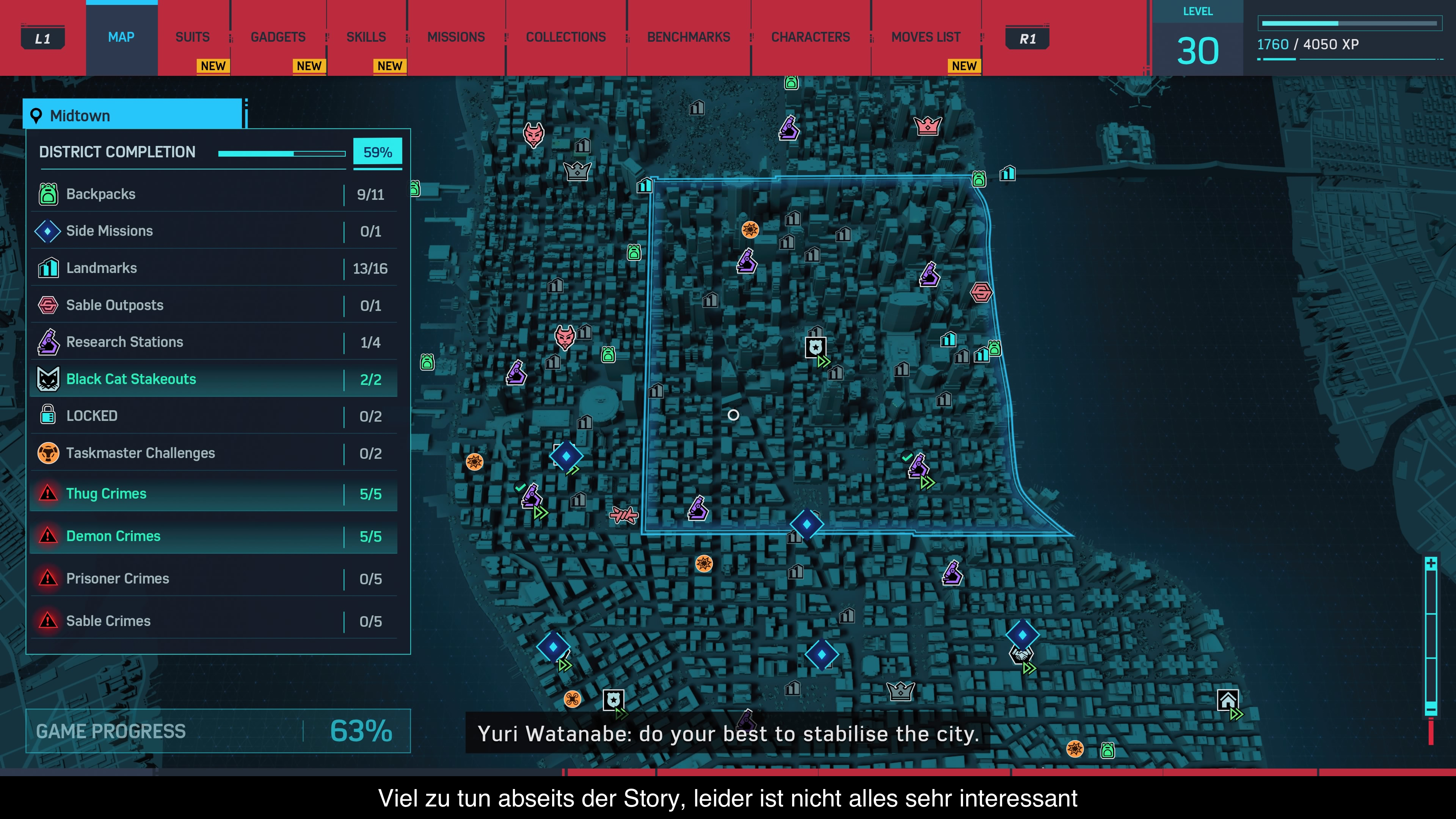 Im Kern ist Spider-Man ein waschechtes Open-World Spiel. Wenn man nicht gerade der Hauptgeschichte folgt, kann man sich die Zeit mit unzähligen Dingen vertreiben. So gibt es in der Welt immer wieder Verbrechen, die man natürlich vereiteln kann oder man macht eine Rundreise und schießt Bilder von Sehenswürdigkeiten der Stadt. Es gibt auch ein paar Nebenaufgaben, in denen man Kleinigkeiten für die Bürger der Stadt erledigen darf. Zwar hat man jede Nebenaufgabe mit einer eigenen sehr kurzen Geschichte ausgestattet, aber wirklich interessant sind die wenigsten. Das betrifft auch das Gameplay und so bekommt man nur mehr Kämpfe geboten. Hier hätte man sicher mehr Liebe zum Detail erwartet, insbesondere da Spider-Man ein reiches Angebot an kleineren Bösewichten hat, die man hier hätte verwenden können. Ansonsten gibt es aber noch Türme, die die Karte sichtbar machen, Basen die man freikämpfen muss und und und. An Nebenaktivitäten mangelt es somit sicher nicht, auch wenn nicht alles interessant ist.