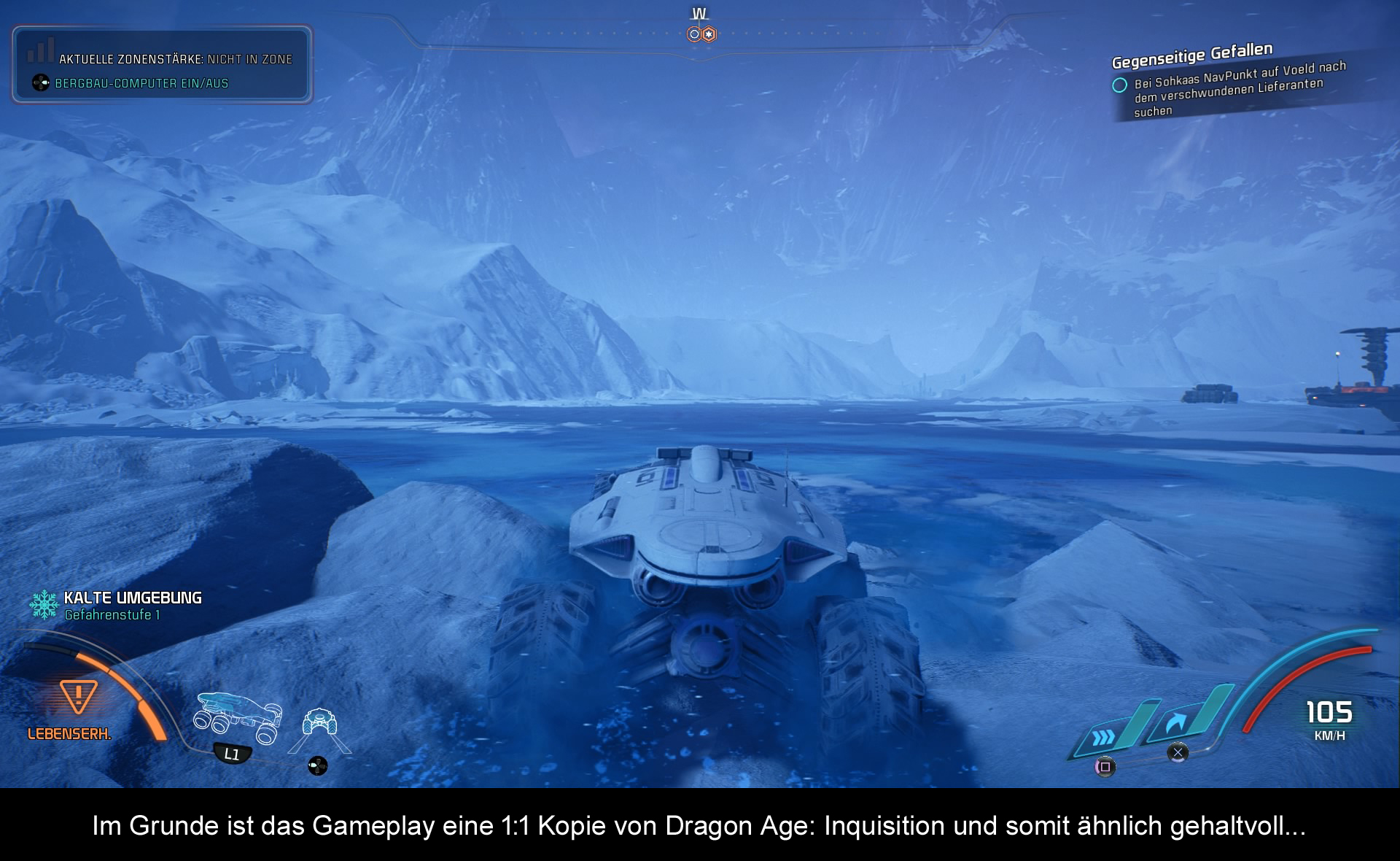Ich mag zum Beispiel keine Rollenspiele oder Spiele überhaupt, die durch langweilige und unnötige Aufgaben aufgebläht werden. Deshalb kann ich z.B. der „Far Cry“ Reihe nichts abgewinnen. Bei „Mass Effect“ war man bislang sicher: Die Levels waren oft geradlinig entworfen, boten tolle Umgebungen und lediglich ein paar Lokalitäten besaßen etwas mehr Freiheit. Klar, es gab auch Abschnitte, in denen man mit dem Mako die Planeten erkunden durfte. Aber da gab es nur eine Handvoll interessante Sachen zu entdecken. In „Andromeda“ ist das anders, die wenigen Planeten bieten weitaus größere Areale, die man durchstreifen darf und Marker – es gibt ohne Ende Marker für alle möglichen Aufgaben. 70% sind davon allerdings reine Zeitverschwendung. Dass alles erinnert so frappierend an das letzte „Dragon Age“ Spiel, dass ich mehrmals unterbrechen musste, weil ich eingeschlafen war! Und das ist nicht die einzige Spielmechanik, die nicht sonderlich spaßig ausfällt. Die Quests sind wenig spannend, das Crafting System ist komplett überflüssig, genauso wie das Loot-System, das so viele Waffen bietet, die sich nur kaum unterscheiden. Ach und ähnlich wie in „Assassins Creed“ darf man auch noch rudimentären Basenbau betreiben und Teams ausbilden und auf Missionen schicken (kostet Zeit und bringt – NICHTS). Im Endeffekt kann man „Mass Effect: Andromeda“ als regelrechte Kopie von „Dragons Age: Inquisition“ bezeichnen. Nur eben ohne Elfen, Zwerge und den ganzen Fantasy-Kram. Dafür aber mit allen Schwächen des anderen Bioware Rollenspiels.