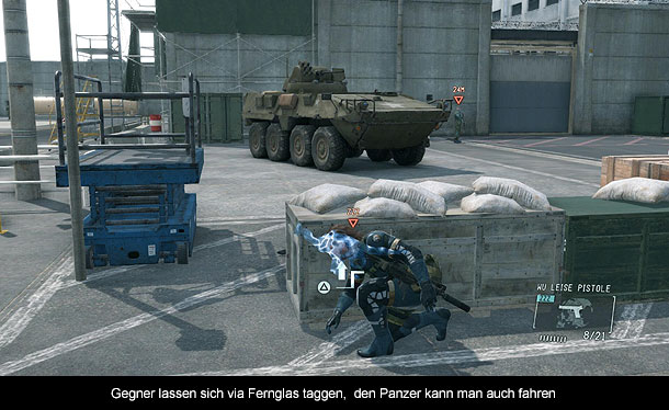 Spielerisch hat sich seit „Metal Gear Solid 4“ einiges getan. Denn „Ground Zeroes“ führt erstmals eine wirkliche offene Welt in der Serie ein. So kann man nun die komplette feindliche Basis mit allen Anlagen, Wachtürmen und Untergrundtunneln erkunden und es werden einem kaum Grenzen gesetzt. Zwar sind einige Türen verschlossen, aber die Größe des Levels sollte genügend Raum dafür bieten. Dabei muss man jedoch immer wieder aufpassen, dass man nicht entdeckt wird, denn vorbei sind die Zeiten des Radars. Man muss sich nun selber umsehen und Feinde entdecken, wobei diese markiert werden können, um sie nicht so schnell aus den Augen zu verlieren. Wird man doch mal entdeckt, erhält man ein kurzes Zeitfenster, in dem man den Gegner noch ausschalten kann. Ansonsten wird der Alarm aktiviert, es wird Verstärkung angefordert und man sollte lieber das Weite suchen. Dabei kann man sich natürlich fast wie in einem First Person Shooter durch die Gegnermaßen kämpfen, aber sinnvoller ist es sich in Gräsern und Büschen oder neuen Gebäuden zu verstecken und abzuwarten bis der Alarm abgeschaltet wird. Etwas nervig kann dabei sein, dass scheinbar unendlich viele Feinde vorhanden sind. Denn sobald eine Gruppe ausgeschaltet ist, kommt direkt die nächste und es nimmt nie ein Ende. Auch komisch ist das Verhalten der KI. Diese übersieht während eines Alarms gerne umherliegende Leichen, sobald dieser abgeschaltet wird und die Wache wieder an der gerade noch uninteressanten Leiche vorbeikommt, beginnt der Alarm von vorne und man darf sich weiter verstecken. Ansonsten dürften sich Metal Gear Fans direkt wieder heimisch fühlen, da die Steuerung kaum bis marginal verändert wurde. Komplett neu sind jedoch Fahrzeuge, die erstmals auch selber gesteuert werden können. Wer also in „Ground Zeroes“ schnell von A nach B kommen möchte, kann sich auch einen der Jeeps einer Wache zu eigenmachen und dann durch die Welt Fahren. Dabei steuern sich alle Fahrzeuge recht intuitiv und könnten so manchem anderen Open World Spiel Konkurrenz machen. Für „Ground Zeroes“ sind sie aber noch nicht wirklich sinnvoll. Neben der Hauptmission „Groud Zeroes“ werden nach dem Durchspielen übrigens noch fünf weitere Nebenmissionen freigeschaltet, die am selben Ort stattfinden, aber andere Ziele und meist auch andere Tageszeiten bieten, ansonsten aber ziemlich uninspiriert daherkommen und kaum für Spannung sorgen können.