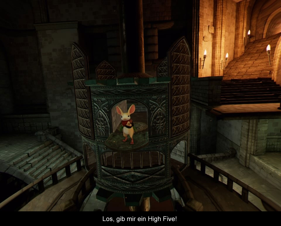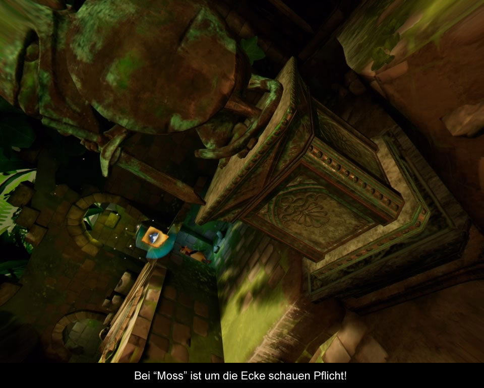 Das Polyarc nicht nur bei der Steuerung VR verstanden haben, beweisen sie auch bei der Fülle an liebevollen Details, welche zeigen, dass die virtuelle Realität nicht nur in der Ego Ansicht Sinn macht. Die abwechslungsreichen Dioramen sind einfach wundervoll in Szene gesetzt und strotzen nur so vor Details und kleinen Geheimnissen. Das beim ersten Durchspielen etwa fünf Stunden (ein schneller Durchlauf kann auch schon in zwei Stunden abgehandelt werden) lange Abenteuer führt euch dabei durch helle und dunkle Wälder, kleine Dörfer, muffige Dungeons und Ruinen. Dabei kommt das Bild sehr scharf daher, dass Flimmern hält sich in Grenzen und nur in der Ferne ist diesiges Wetter auszumachen. Stetig wird man beim Erkunden verleitet mal aufzustehen, um über etwas drüber zu schauen, sich zu bücken oder hinter Ecken zu blicken. Und das ausgiebige begutachten der Level lohnt sich, da neben netten Details auch Schriftrollen auf ihre Entdeckung warten. Hinzu kommt die Interaktion mit Quill und das durchbrechen der vierten Wand. Ihr könnt die Maus streicheln, in einigen Situationen ein High Five verteilen, Quill erschrecken und auch so nah rangehen, dass er sich bedrängt fühlt. Quill wurde dabei sehr liebevoll und umfangreich animiert und selten sah eine Spielfigur derart putzig aus, wenn sie läuft, klettert, sich abrollt, kämpft, Gras mit dem Schwert mäht, ängstlich ist oder sich einfach nur zickig oder beleidigt benimmt. Daneben gibt es hübsche Pausenanimationen (kennen die älteren vielleicht noch aus 16Bit Tagen) und kleine Tips und Wegweisungen durch Quill. Abzüge gibt es höchstens für die wenigen Animationen und Ereignisse innerhalb der Level, da man nur selten anderes Getier durch die Dioramen streifen sieht. Da die Kamera starr ist und sich nur der eigene Kopf bewegt, muss man bei “Moss” übrigens kein Motion Sickness befürchten, was somit für die ersten virtuellen Schritte mehr als geeignet ist. Der Soundtrack steht ganz nebenbei erwähnt der tollen Grafik in fast nichts nach und bietet schöne Melodien, die die Atmosphäre gekonnt ergänzen. Nur die Soundeffekte könnten einen Tick kraftvoller daherkommen. Polyarc zeigt damit eindrucksvoll, wie man die isometrische Ansicht perfekt für VR nutzen kann und man kann nur hoffen, dass weitere Adventures wie dieses folgen werden. Oder stellt euch mal andere Genre damit vor. Sicher würde sich auch ein neues Diablo, Command and Conquer oder Syndicate hervorragend in die virtuelle Realität übertragen lassen, um neue Sichtweisen für neue spielerische Ideen zu ermöglichen.