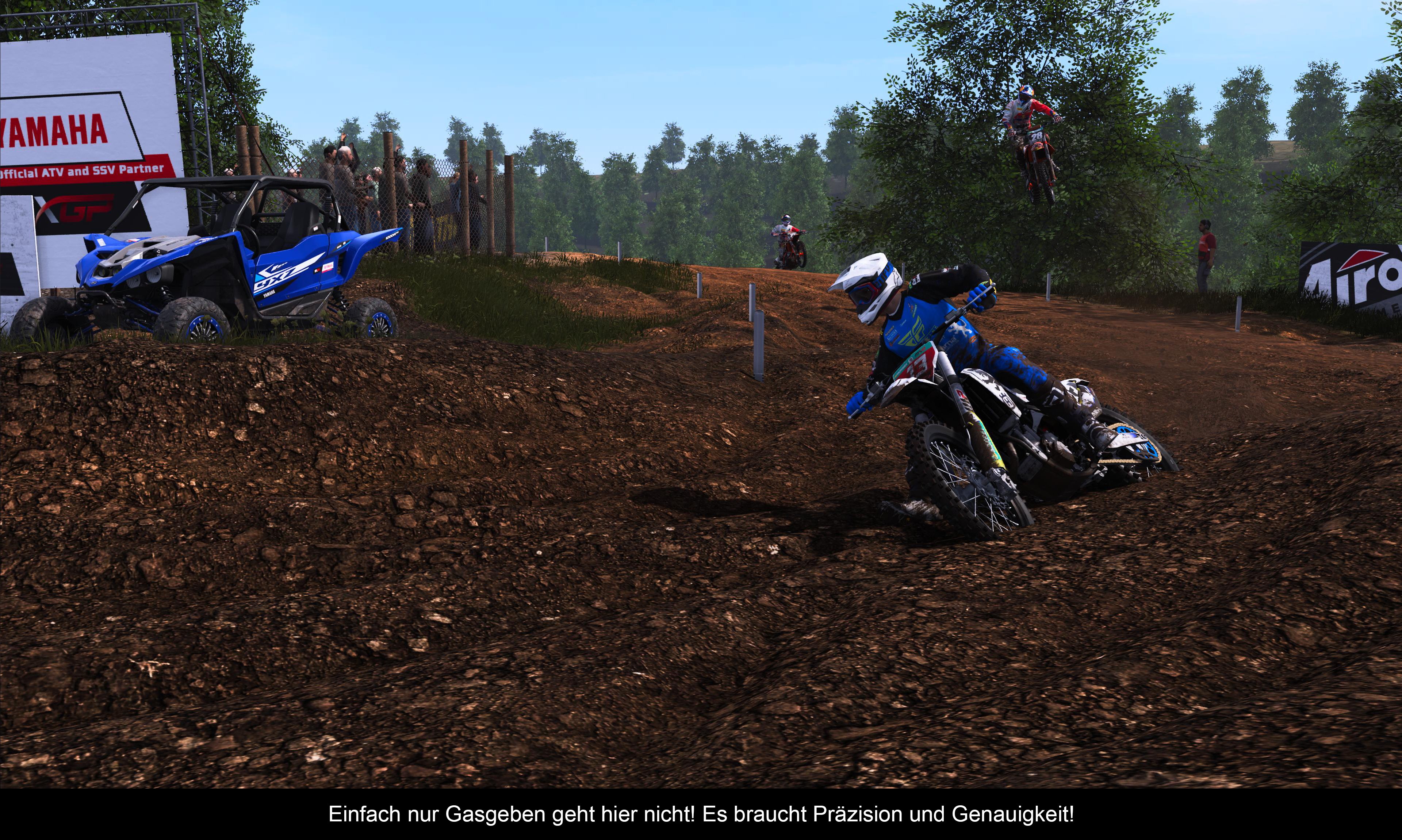 Was das Gameplay angeht, lautet das Motto bei MXGP wie auch in der Vergangenheit „Einfach zu lernen, aber schwer zu meistern“. Festzuhalten bleibt jedoch die Tatsache, dass man selbst im einfachen Schwierigkeitsgrad nicht einfach drauf los brettern kann. Ein gutes Timing ist stets wichtig, um geschmeidig durch die Kurven zu kommen oder bei Landungen nicht plötzlich ins Aus geschleudert zu werden. Wenn es jedoch mal kracht, kann man auf die gute alte Replay-Funktion zurückgreifen, wo die Zeit zurückgedreht wird und ihr einen neuen Versuch unternehmen könnt, um nicht von euren Gegnern überholt zu werden. Diese überraschen nämlich mit einer gesunden Aggressivität, wo jeder Fehler des Spielers sofort ausgenutzt wird. Dies hat aber auch zur Folge, dass sich jeder Sieg absolut verdient anfühlt, da man nicht einfach allen Fahrern davonrasen kann (es sei denn natürlich, man benutzt die ganze Zeit die Replay-Funktion...). Lobenswert ist auch die gelungene Anwendung der Rumble Funktion des neuen PS5 Controllers. Die Vibrationen orientieren sich am Belag der Strecke und wirken zu keiner Zeit übertrieben oder anstrengend. Stattdessen tragen sie ordentlich zum Gameplay-Feeling bei. Fans des Rennsports können übrigens auch auf die Simulations-Steuerung zurückgreifen, wo ihr von der Bremse bis zum Fahrer fast jeden Aspekt eures Motorrads im Auge behalten muss. Zugegebenermaßen war dies jedoch etwas zu hart für mich, wodurch ich fast immer Gebrauch vom einfachen Gameplay gemacht habe. Ein umfangreiches Tutorial hätte dieses Problem eventuell beseitigen können, aber auch diesen sucht man hier vergebens.