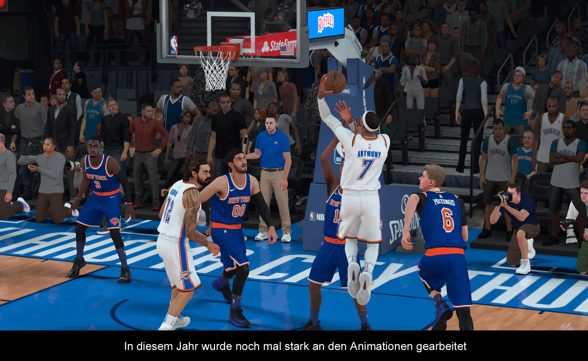 Was die Grafik und Präsentation angeht, ist NBA 2K18 immer noch auf Referenz-Niveau. So kann die Darstellung der Spiele mit seinen gelungenen Kamerafahrten und Einspielern absolut mit seinem Fernseh-Pendant mithalten. Neue Animationen bei den Fans und im Stadion lassen das Geschehen noch spektakulärer wirken als je zuvor. Hinzukommen überarbeite Spielermodelle, die immer noch fantastisch aussehen (Minuspunkte gibt es jedoch erneut für die Modelle von weniger bekannten Spielern, die im Vergleich zu den Westbrooks und Currys der Liga deutlich schwächer aussehen) Was jedoch enttäuscht ist die eingangs erwähnte trostlose Umgebung der Open World im MyCareer-Modus und die nervigen Ladezeiten, die schlicht und einfach viel zu lang sind. Was den Sound angeht, umfasst NBA 2K18 mal wieder einen gelungenen Soundtrack (mit einem Mix aus Rap, Pop und Rock) sowie ein Kommentatoren-Team, welches man jedoch langsam sein Alter anmerkt. Viele Kommentare kennt man bereits aus vorherigen Spielen, und es kommt einfach nicht mehr die gleiche Atmosphäre rüber, wie noch zu Beginn der Generation. Dennoch ist das Kommentatoren-Team immer noch deutlich besser als die Kollegen von FIFA oder PES, die in unseren Gefilden wohl am bekanntesten sind.