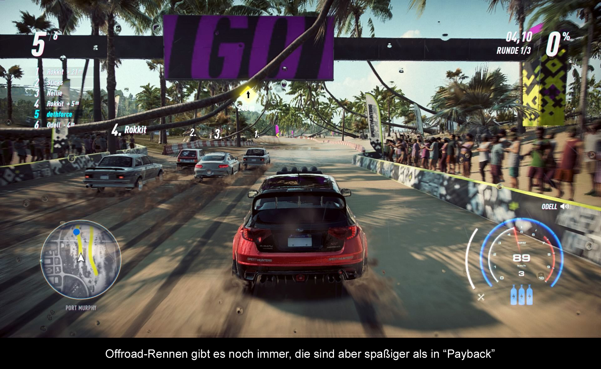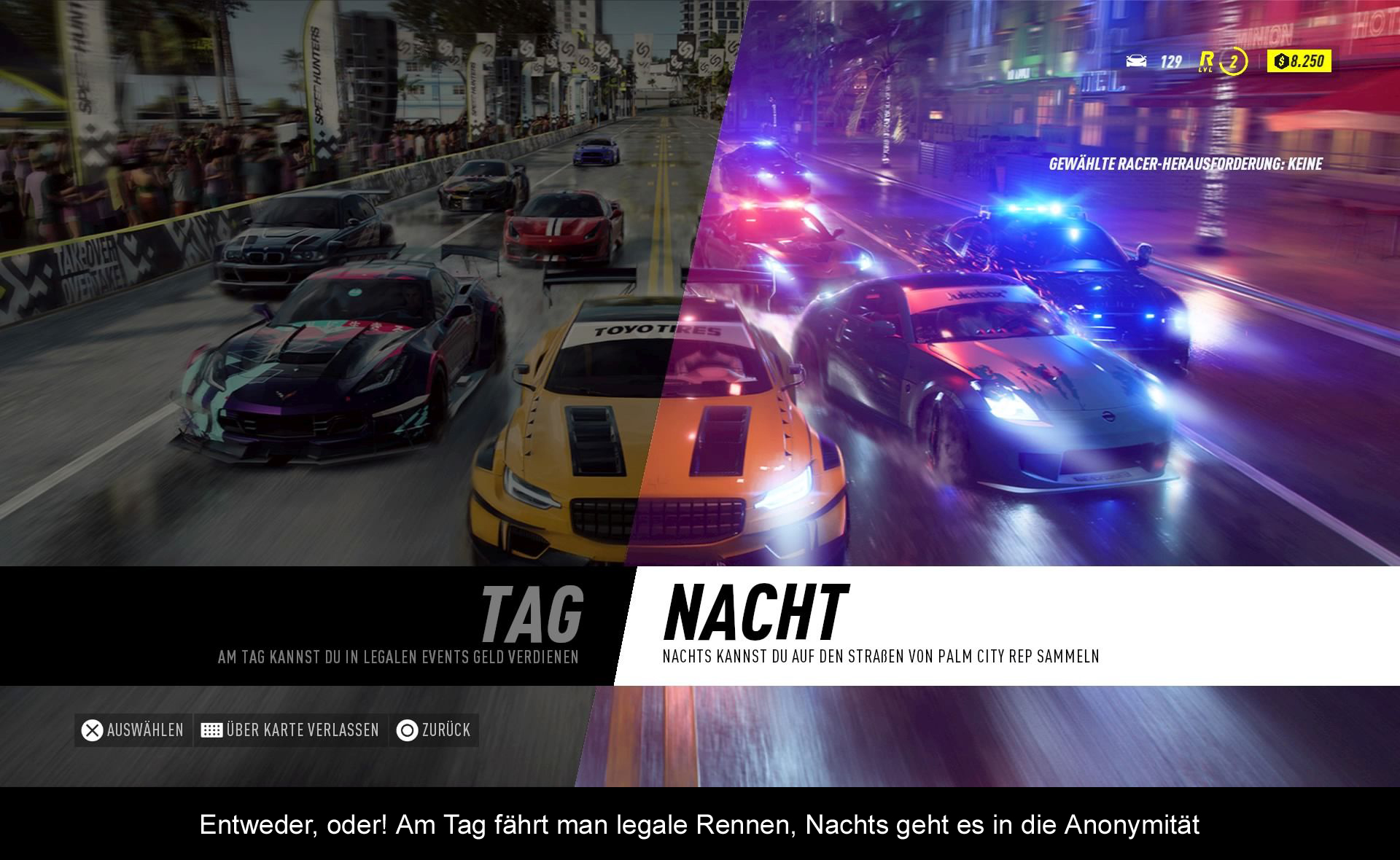 Noch ein paar Sachen, die man zum Spiel anmerken sollte. Der Titel lässt sich gleich im Multiplayer-Modus oder im Singleplayer-Modus starten. In ersterem kann man einer Crew beitreten und mit diesen Rennen bestreiten und diverse Boni wie verbesserte Heat-Multiplikatoren abgreifen. Bei Zweitem, also dem Einzelspieler-Modus, ist man dennoch auf die Server von EA angewiesen. Denn wenn diese Offline sind, kann man keine Teile oder Fahrzeuge kaufen. Auch komisch sind die Fahrzeugstufen-Anforderungen bei den Rennen. Vor allem bei den Offroad und Drift-Events. Denn hier gibt es nicht so viele Rennen, als das man genügend Geld für das Tuning gewinnen könnte. Und was ebenfalls verwunderlich ist: In der Nacht schaltet man spezielle Herausforderungen ab Heat-Stufe 3 frei. Hier winken bei höherem Risiko spezielle Teile – die aber nicht immer besser sind, als das, was man im Wagen verbaut hat. Zudem nervt es, dass man jedes Mal erst zu dem jeweiligen Rennen (egal welches und welche Tageszeit) fahren muss und es keine Option zur Schnellreise gibt. Dafür kann man durch fast alle kleineren Objekte hindurchrasen. Glaubt mir, würde man sonst an jedem kleinen Aufsteller oder Straßenbegrenzung hängen bleiben, wäre das ein herber Schlag für den Spielspaß. So aber haben die Entwickler eine gute Balance gefunden (große Bäume sind nach wie vor ein Hindernis), was wiederum dem gewöhnungsbedürftigen Handling zugutekommt.