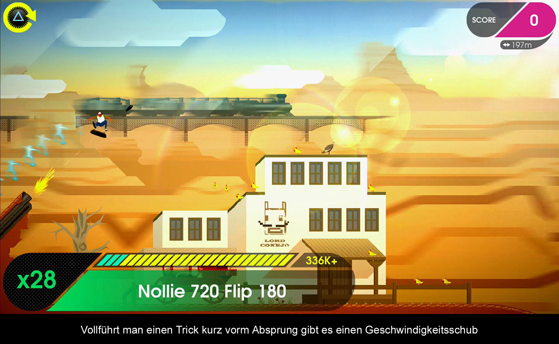 Im Vorgänger gab es eigentlich nur zwei Arten an Tricks. Die normalen Skateboard-Tricks, wie ein Olli oder der Heelflip und die vielen Grindarten, um geschmeidig über Stangen, Fahrzeuge und Häuserdächer zu rutschen. Ausgeführt werden die Tricks mit dem linken Analogstick, indem man z.B. eine Halbkreis-Bewegung ausführt und ihn dann loslässt. Besonders wichtig hierbei ist das Timing beim Landen bzw. Grinden und diesen Grundsatz führt OlliOlli2 konsequent weiter. Jedoch wurde das Repertoire an Tricks noch ein wenig ausgebaut. So gibt es nun einige schwierigere Tricks, aber auch völlig neue Arten, um die Tricks zu langen Combos zu kombinieren. Die einfachste Möglichkeit ist bei der Landung einen Manual zu landen, welcher die Combokette nicht unterbricht. Hier kann man sogar bei der Landung erst einen Reverse machen, sich also bei der Landung mit dem Bord drehen und dann in einen Manual übergehen. Ähnliches kann man auch beim Grinden ausführen, wo man nun zwischen unterschiedlichen Grinds wechseln kann, wenn der eigentliche Grind perfekt ausgeführt wird. All das sorgt dafür, dass der Combocounter in die Höhe schießt und man ein Level in einer einzigen langen Combo abschließen kann. Anfangs mögen die neuen Möglichkeiten etwas viel auf einmal sein, jedoch gewöhnt man sich schnell an die einzelnen Tricks und dann sind Reverse Manuals, Grinds & Co. kein Problem mehr und hier liegt auch die Stärke von OlliOlli2. Die unzähligen Möglichkeiten an Tricks laden zum Ausprobieren ein und obwohl die Steuerung anfangs wenig intuitiv rüberkommt, entsteht starkes Suchtpotential, weil Stürze nur die eigene Schuld sind. In Sachen Umfang bekommt man es wie im Vorgänger mit fünf Welten und insgesamt 50 Levels und dazugehörigen Spots zu tun, die jeweils fünf Aufgaben für einen bereithalten. Beispielsweise muss man einen Highscore knacken oder aber im Level verteilte Embleme einsammeln. Manche der Aufgaben sind dabei relativ einfach zu lösen und andere wiederum benötigen etwas Training, weil man z.B. bestimmte Tricks in die Combo einbauen muss. Aber letztlich lernt man auch so die einzelnen Spielmechanismen perfekt kennen. Des Weiteren gibt es nun Alltagsaufgaben, in denen ihr euch täglich in einem Level mit der ganzen Welt messen dürft. Hier dürft ihr zuerst einige Runden zum Training drehen und habt dann genau einen Versuch, um euch in die Leaderboards einzutragen. Insgesamt gibt es also genug zu tun in „OlliOlli 2“.