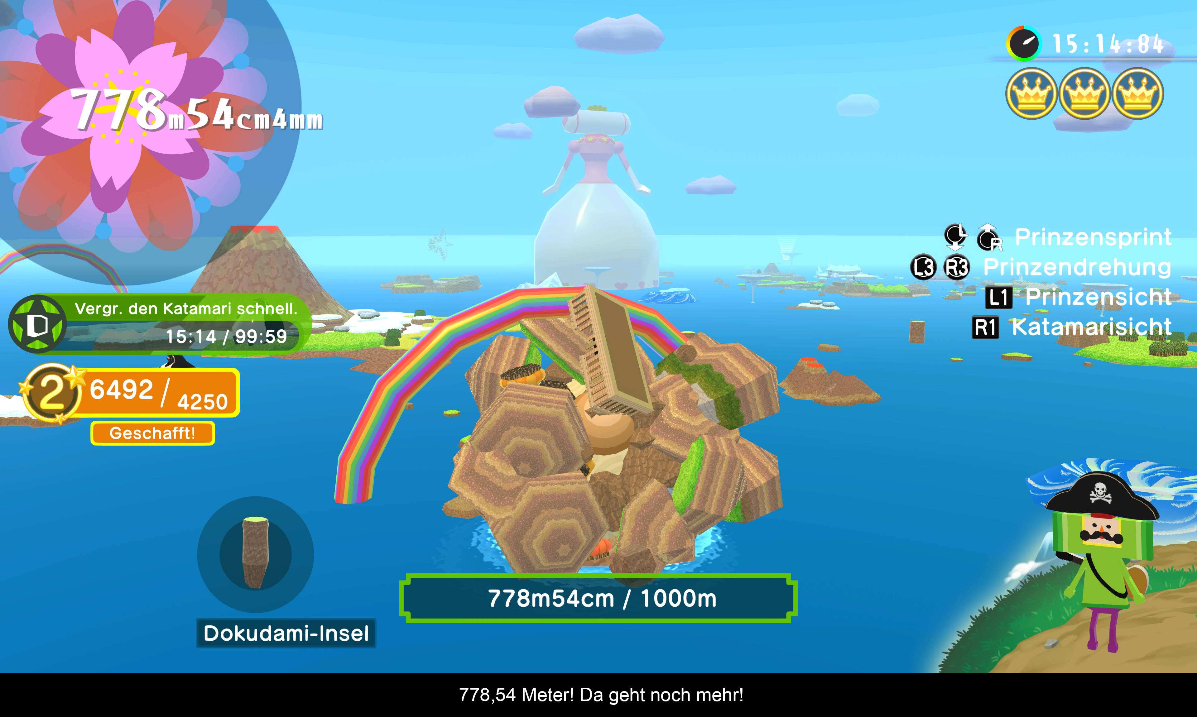 Das Spielprinzip scheint simpel: Rolle deinen Ball und sammle alle Objekte auf, bis du eine gewisse Größe erreicht hast. Das hört sich überschaubar und leicht an. Doch den Ball das machen zu lassen, ist die große Kunst! Die klassische Steuerung stammt noch aus der Zeit der „Tank“-Steuerung. Um den Ball zu rollen oder bestimmte Manöver (schnelle Wende, Turboschub etc.) durchzuführen, werden beide Analogsticks gebraucht. Wer nicht in Nostalgie schwelgen möchte, kann auf die neue Steuerung umstellen, bei der ein Stick den Ball und einer die Kamera steuert. Hat man sich mit der Steuerung arrangiert, beginnt der wahre Spaß. Für jedes Level gibt es eine Zielvorgabe, beispielsweise hinsichtlich der Größe oder der benötigten Zeit. Eure Aufgabe ist es, den besten Weg zu finden und Objekte möglichst geschickt aufzurollen. Wie weit ihr diese aufrollen könnt, hängt auch von der Größe des Balles ab. Dadurch kann man bei größeren Gegenständen schon mal abprallen und verliert ein paar Objekte. Doch mit der Zeit wird ein Hindernis zum weiteren Teil des Balls. So wechselt ihr innerhalb der Levels in unterschiedliche Areale. Eine kurze Ladepause zum Erstellen der neuen Objekte wird durch einen lustigen Satz des Königs überbrückt. Ist die Zeit abgelaufen oder die Zielgröße erreicht, folgt die Bewertung. Eine D-Bewertung reicht aus, um das Level zu bestehen, aber am Ende möchte man natürlich die beste Bewertung, ein S, erreichen. Egal, wie das Ergebnis ausfällt, es wird zu einem neuen Stern im Kosmos oder zu Sternenstaub.