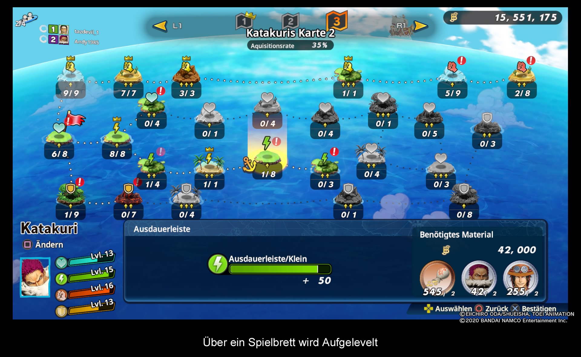 Die größte Änderung beim Gameplay betrifft die Spezialattacken. Beim Vorgänger existierte ein Buddy-System und Leisten für den Spezialangriff. Davon hat man sich komplett verabschiedet und gibt dem Spieler die Möglichkeit, jederzeit einen von insgesamt vier Spezialangriffen auszuführen. Diese benötigen zwar einen Cooldown, lassen euch jedoch mehr Freiraum beim Experimentieren. So kann man gezielt auswählen, welche Gear-Formen Ruffy im Kampf nutzen soll. Verlässt man sich lieber auf leichte Spezialangriffe, welche einen schnellen Cooldown haben, oder auf Starke, die gefühlt ewig zum Aufladen brauchen. Auf einem neuen Spielbrett lassen sich dies Angriffe mit Münzen freischalten und im Missionsbildschirm zuweisen. Über dieses Spielbrett erarbeitet man sich auch Stärke, Verteidigung usw. Das übliche Leveln von Charakteren wird so durch das Grinden von Münzen ersetzt. Auch keine optimale Lösung, doch wesentlich besser als noch im Vorgänger. Zu guter Letzt kann man noch weitere Skills zuweisen, welche die Verteidigung erhöhen, oder für mehr Geld sorgen. Von allen bisherigen „Pirate Warriors“-Spielen besitzt der aktuelle Teil also das mit Abstand beste System, welches auch die meiste Flexibilität ermöglicht.