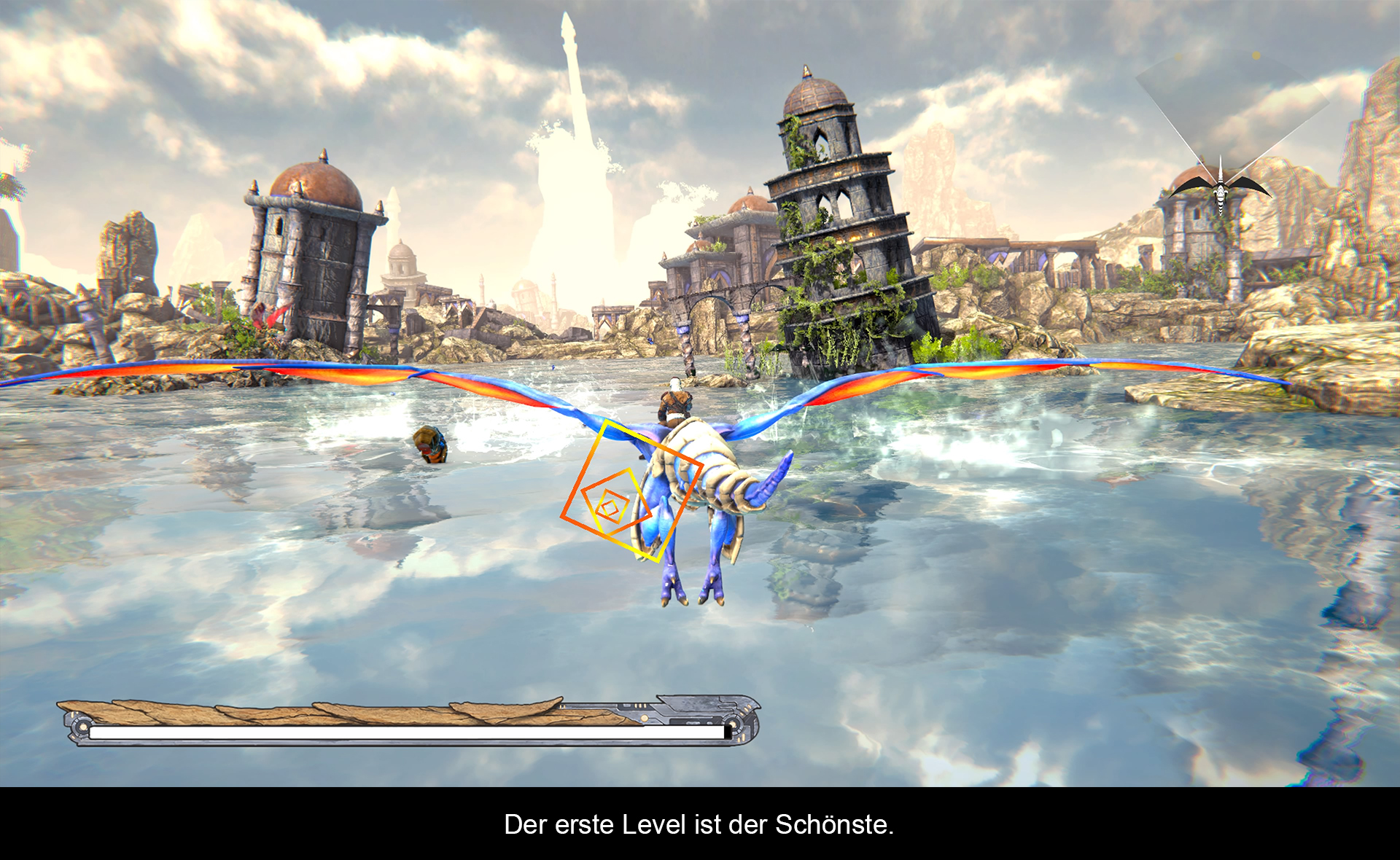 Das Original protzte mit einem 7-minütigen CGI Intro, welches nun in Echtzeit nachgebaut wurde. Im Gegensatz zu damals ist das was jetzt über den Bildschirm flimmert allerdings weit weniger beeindruckend und eher ernüchternd. Dies liegt vor allem an der nicht durchgängig flüssigen Bildwiederholungsrate und den etwas einfachen Modellen sowie steifen Animationen. Das Design, welches an das osmanische Reich sowie den Anime Klassiker "Nausicaä" (Studio Ghibli) erinnert, ist jedoch noch immer sehenswert und wird in vielen Zwischensequenzen inkl. cooler Kunstsprache dargeboten. Unser Charakter reitet mit seinen Kumpels nichtsahnend durch die Wüste, als er Zeuge eines Luftkampfes zwischen zwei Drachen wird. Durch unglückliche Umstände wird er in den Kampf verwickelt und erbt durch das Ableben des Helden die Aufgabe das Böse zu besiegen. Elegant wird einem auch gleich die Spielmechanik erklärt. Kurz vorm Tod des Reiters sagt dieser nämlich noch: "der Drache kennt den Weg!".