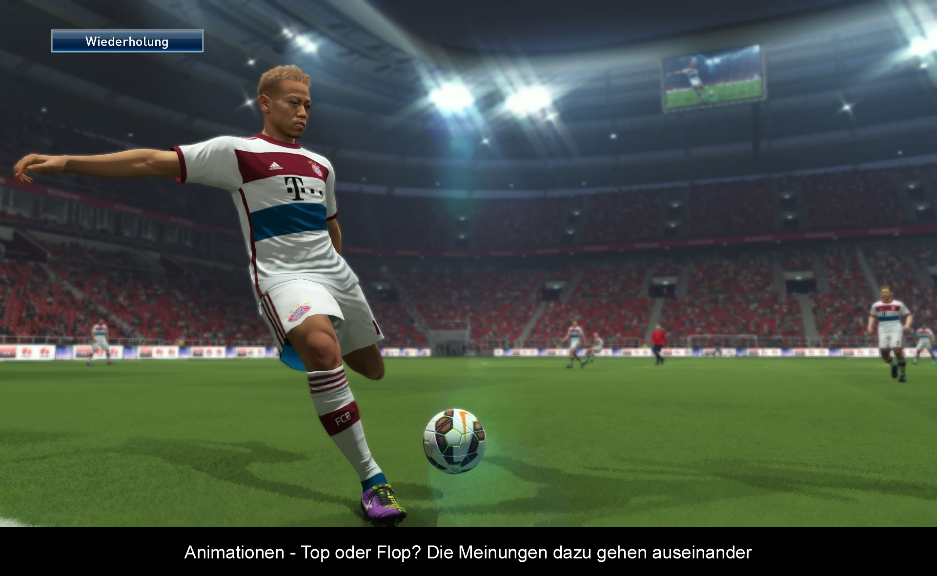 Wie auch im vergangenen Jahr basiert die technische Grundstruktur des Spiels auf Kojimas Fox Engine. Im Vergleich zum Vorjahresprodukt läuft das Geschehen aber inzwischen deutlich flüssiger über den Bildschirm. Darüber hinaus können sich PS4 Spieler extrem glücklich schätzen. Nur auf der Sony Konsole läuft das Spiel in wunderschönen 1080p und 60fps. Alle anderen Versionen zeigen hingegen deutliche Abweichungen. Trotzdem sollte man keine Grafikbombe erwarten. Obwohl die PS4 für ihre grafische Power bekannt ist, kommt sie bei PES nur bedingt ins Schwitzen. Und was die virtuelle Darstellung der einzelnen Kicker angeht, erwartet dem Spieler ein zweischneidiges Schwert. Während die Stars meistens überragend aussehen, sehen die vielen unbekannten Kicker oftmals sehr generisch und langweilig aus. Ein großes Lob verdienen jedoch die zahlreichen Animationen, die äußerst rund und geschmeidig aussehen. Und auch die Ladezeiten sind erfrischend kurz. Ebenso kurz ist aber auch die Liste an verfügbaren Stadien. Hier wäre es wünschenswert gewesen, wenn man uns ein wenig mehr Auswahl zur Verfügung gestellt hätte. Des Weiteren erhoffe ich mir für das nächste Jahr ein schöneres Publikum, da die pixeligen Figuren des diesjährigen PES nur bedingt überzeugen können. Alles in allem wäre es schön, wenn nicht nur EA, sondern auch Konami nochmal ein wenig an der Grafikleistung ihrer Spiele schrauben könnten. Ein bisschen mehr ist da mit Sicherheit noch drin. Vor allem was die Publikumsdarstellung und das Stadiongefühl angeht.