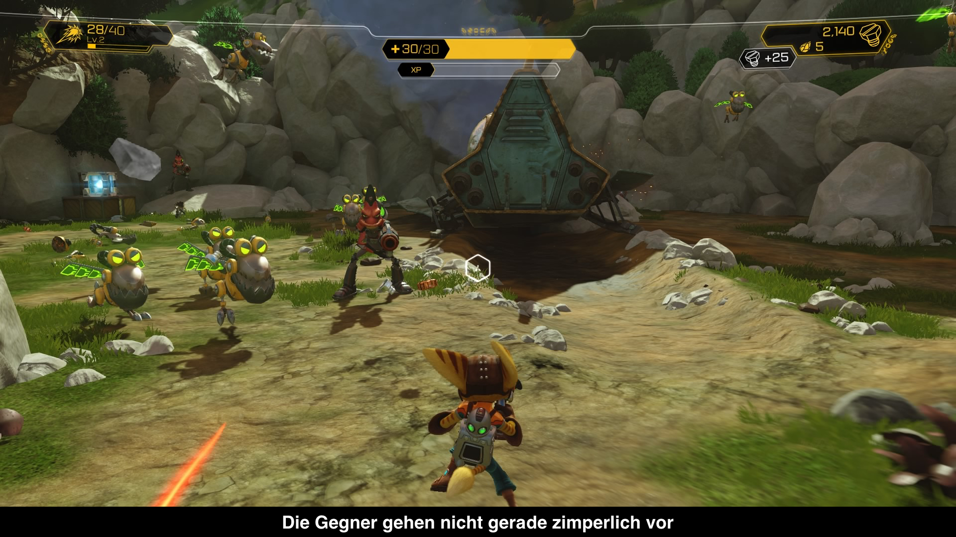 In Sachen Gameplay gibt es natürlich gewohnte Kost aus der Serie, aber man hat nicht einfach das Original kopiert, sondern sich quasi überlegt, wie das damalige Spiel heute entwickelt worden wäre. Das heißt auch das zahlreiche Neuerungen die erst später Einzug in die Serie gefunden haben, hier dabei sind. Seien es Gadgets, Features oder Waffen. Vor allem die Waffenauswahl ist die beste der ganzen Serie und man ist immer wieder erstaunt über die Kreativität von Insomniac Games. Der Pixelator oder der Groovitron sind hier insbesondere zu nennen, die man sonst wohl nirgendwo finden würde. Natürlich gibt es auch klassischere Waffen, was aus dem Jump’n Run in Kampfszenen fast schon einen 3rd-Person Shooter macht. Dieser ist dabei gar nicht so leicht, weil die Gegner in Scharen auftreten und dank der verrückten Waffen ein echtes Effektfeuerwerk auf dem Bildschirm gezaubert wird, was das ganze etwas unübersichtlich werden lässt. Vor allem auf höheren Schwierigkeitsgraden muss man durchaus taktisch vorgehen, sodass auch ältere Spieler ihren Spaß haben können. Unterteilt ist das Spiel übrigens in unterschiedliche Planeten auf denen ihr meist mehrere Aufgaben zu erledigen habt, wovon ein Teil optional ist. Wer sich aber auch diesen annimmt, bekommt besonders viele Schrauben zum Upgraden oder andere schöne Gadgets. An Abwechslung mangelt es also nicht und auch Kenner des Originals werden ihren Spaß haben. Denn Insomniac Games hat ganze Areale neu gestaltet oder auch mal weggelassen, sodass es sich wie ein völlig neues Spiel anfühlt.