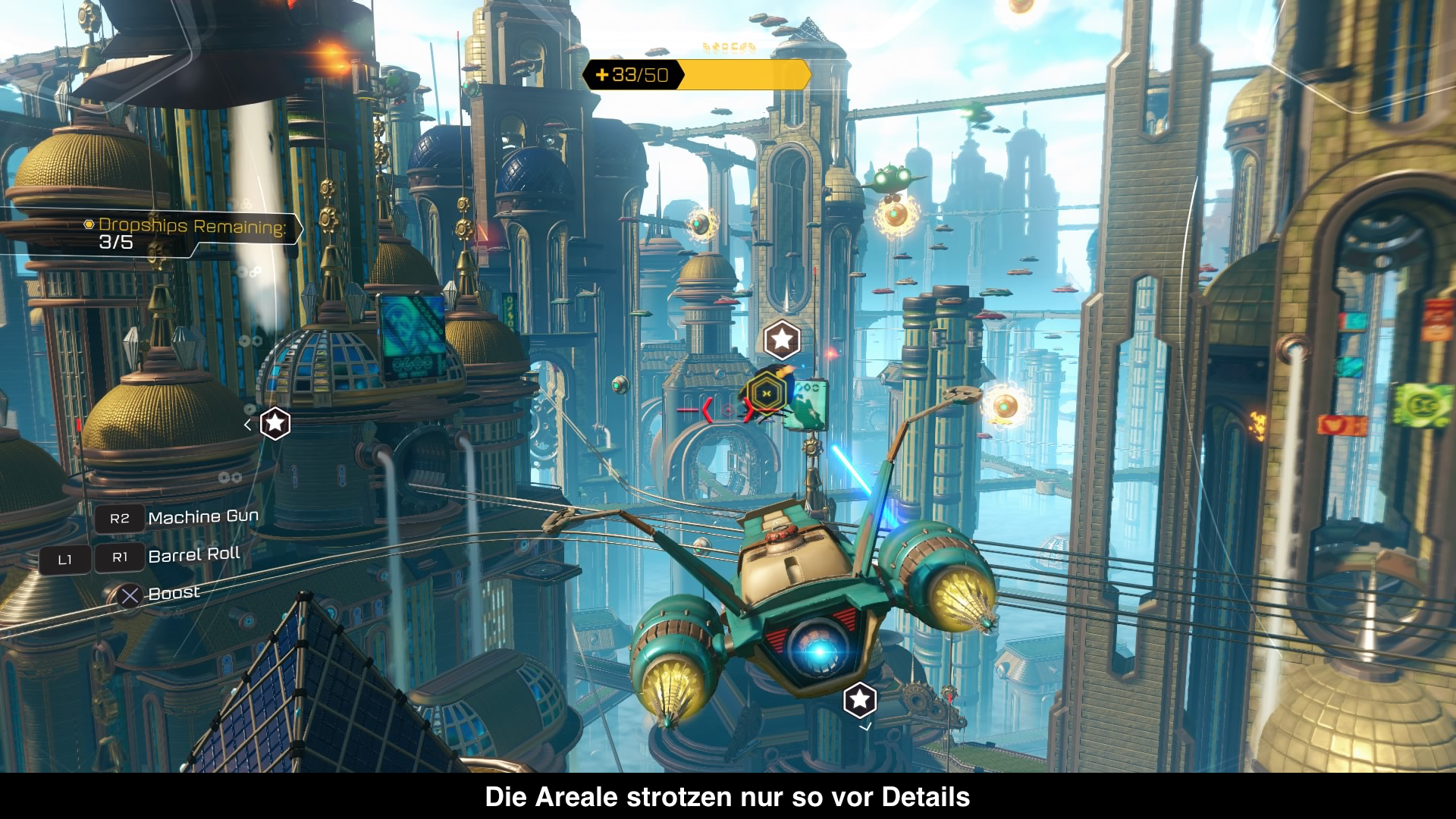Ja, Ratchet and Clank läuft seit einigen Titeln der Serien „nur“ noch mit 30 Bildern pro Sekunde. Aber diese 30 eingesparten Bilder sorgen dafür, dass hier eines der schönsten Spiele dieser Generation auf einen wartet. Ratchet war noch nie flauschiger, die Animationen bei den Helden und Gegnern nie geschmeidiger und die Planeten und Level erst. Keiner gleicht dem anderen und sie strotzen nur so vor Liebe und Details. Alleine wenn man den Groovitron aktiviert und die Gegner, selbst Panzer, anfangen zu tanzen, ist goldwert. Dazu gibt es ein gestochen scharfes Bild und nur minimales Aliasing in einigen wenigen Szenen. Ansonsten gibts keine Grafikfehler und zu 99% ist die Bildrate stabil. Ich glaube mehr kann man hier nicht erwarten. Was den Sound angeht, gibt es zahlreiche schöne Themes, wobei vor allem die Synchro Lob verdient. Wir haben zwar nur die englische Synchro der US-Version testen können, aber hier hat man einen großen Schritt tun können. Möglicherweise dank des Films.