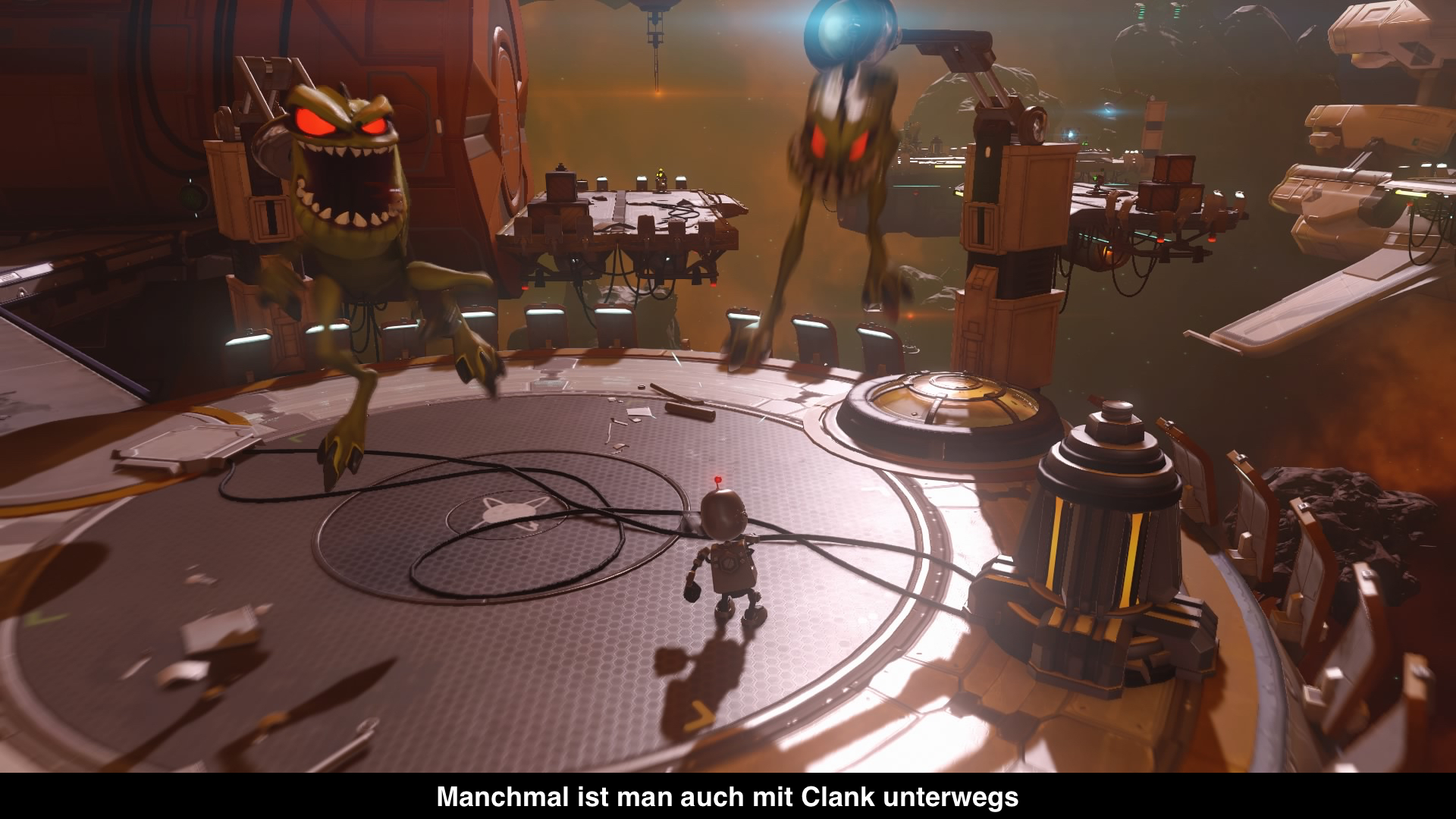 Neben dem Spiel erscheint quasi zeitgleich auch ein Kinofilm mit dem putzigen Duo, der die selbe Geschichte erzählt, nämlich die des ersten Spiels. Darin möchte Ratchet ein Galactic Ranger werden und bewirbt sich deshalb in der Akademie von Captain Quark. Dieser findet aber das Ratchet mehr als nur ungeeignet ist und schickt ihn zurück. Zurück Zuhause fällt aber der kleine Roboter Clank vom Himmel, welcher eigentlich ein Kampfbot ist, aber wegen einer Missfunktion zu einem guten Roboter wurde. Deshalb möchte er die Galactic Ranger warnen, dass eine ganze Roboterarmee die Herrschaft in der Galaxie an sich reißen möchte. So stolpern Ratchet und Clark in ihr großes Abenteuer und sind dabei die Galaxie zu retten. Erfrischend ist hierbei die Erzählweise, weil die Geschichte aus der Sicht von Captain Quark erzählt wir, der natürlich immer wieder seine eigene Größe darstellen muss. Das sorgt für einige Lacher, aber im Vergleich zum Original wird die Geschichte viel oberflächlicher dargestellt. Vor allem das Kennenlernen der beiden Helden wird etwas schnell abgehandelt und wurde im Original deutlich ausführlicher und interessanter dargestellt. Dafür gibt es immer wieder kleine Szenen aus dem Film, aber nicht genug, sodass sich ein Gang ins Kino wohl immer noch lohnen wird.