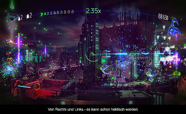 Auf den ersten Blick sieht Resogun recht unscheinbar aus und man könnte meinen, dass es so auch auf der PS3 möglich wäre. Wenn die Action dann aber losgeht, wird einem klar, dass hier etwas ganz besonderes vor einem stattfindet. Denn die ganze Welt und auch die Raumschiffe, sowie Aliens bestehen aus sogenannten Voxels. Voxel sind kleine Quadrate, die statt Polygonen verwendet werden, um die Modelle darzustellen. Die Besonderheit davon ist, dass man damit relativ gut Zerstörungen darstellen kann. Wenn man also einen Gegner erledigt, zerfällt dieser in tausend Einzelteile und das gilt auch für die Stadt, welche unter dem Beschuss leidet. Hinzu kommen dann zig Explosions- und Boost-Effekte, welche wirklich toll aussehen und worunter manchmal sogar ein wenig die Übersichtlichkeit leidet, da teilweise so viel auf einmal los ist. Besonders beeindruckend ist übrigens das Ende eines jeden Levels, wenn alles explodiert. Einfach nur toll! Etwas schade ist jedoch, dass jedes Level in Schwarz/Grün gehalten ist und kaum vom anderen zu unterscheiden ist. Etwas mehr Abwechslung in den Farben oder dem Design der Städte hätte sicher nicht geschadet, ist aber auch kein Beinbruch, da während der Action kaum noch etwas davon zu sehen ist. Soundtechnisch kann man mit einem tollen Elektro-Soundtack überzeugen, der aber in der Standard-Abmischung etwas leise ausfällt. Wirklich cool sind aber die ständigen Soundausgaben am Controller, welche neue Keeper, Multiplikatorenaufstiege und andere Gefahren ansagen und irgendwie das Gefühl vermitteln wirklich in dem Raumschiff zu sitzen.