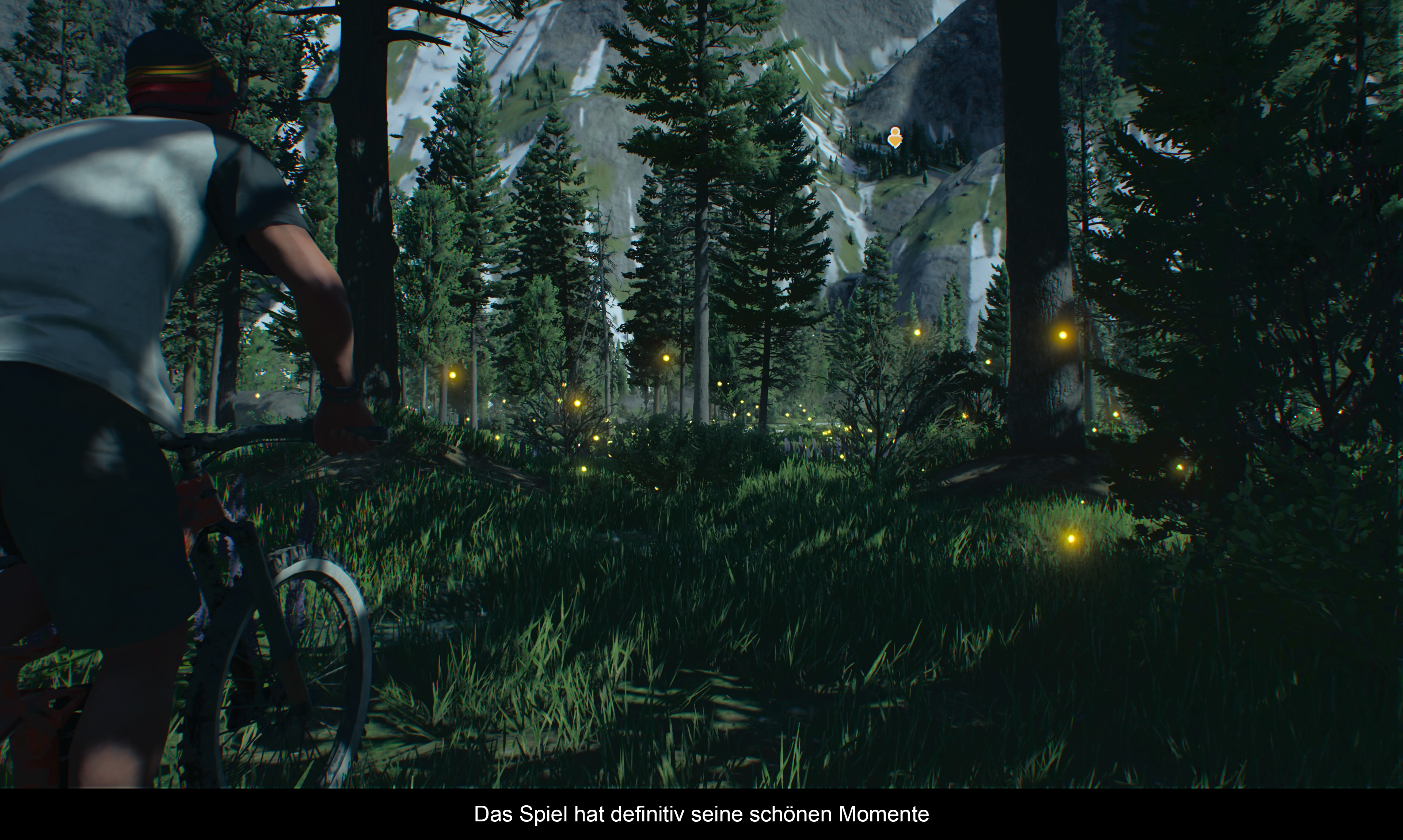 Bereits bei der Beta hatte ich massive Zweifel, in welche Richtung sich dieses Spiel grafisch entwickeln wird. Die konstanten 60FPS und 4K Auflösung sind schon mehr als in Ordnung, aber eigentlich sollte da noch mehr gehen. „Riders Republic“ entpuppt sich somit auf der PS5 als aufgemotzte PS4 Version. Die Kanten sind etwas schärfer und die Ladezeiten kaum existent, aber das war es dann auch schon. Besondere Controller-Features oder gar exklusive PS5 Merkmale (Trophy Tracking) sucht man vergebens. Zumindest konnte das massive Screen Tearing stark eingegrenzt werden und tritt nur noch vereinzelt bei Online Rennen zu tage. Dafür gibt es als Ausgleich massive Pop-Ins. Man merkt richtig, wie sich vor einem die Landschaft aufbaut. Sehr schade, dass man das nicht verhindern konnte, denn eigentlich hat das Spiel seine visuellen Momente! Zum Beispiel das Publikum während der Rennen, oder es gibt einen besonderen Wettereffekt wie einen Kometenschauer zu sehen. In der Spielwelt tummeln sich auch zahlreiche Tiere wie Schlangen, Hasen, Bären oder Fledermäusen. Wenn die Sonne im richtigen Winkel steht, alles in ein sanftes Rot gehüllt wird und man langsam durch ein Feld voller Glühwürmchen fährt, zieht einen die Atmosphäre in seinen Bann. Die Präsentation während der Wettkämpfe fällt nicht sonderlich spektakulär aus. Die Sprecher kommentieren zwar jeden Trick, wiederholen aber zu schnell ihre Phrasen und driften immer wieder in sprachliche Fremdschämbereiche ab. Der Satz: „Da hat wieder jemand Plumps gemacht!“ wird auf Dauer sehr anstrengend. Selbiges gilt auch für den Soundtrack. Dieser könnte durchaus umfangreicher und abwechslungsreicher sein. Teilweise wirkt das Gebotene etwas zu sehr Retro und ich meine hier nicht die klassische Musik, die man auch hören kann.