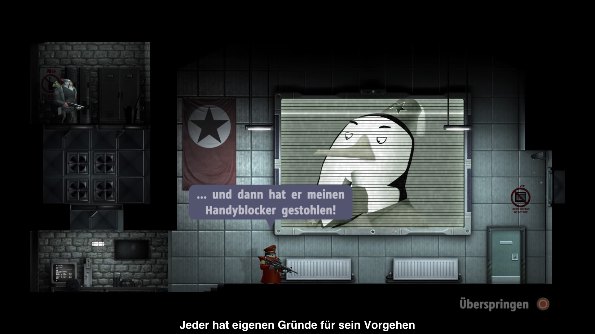 Als letzter Punkt bleibt nur mehr die Grafik und auch hier hat man sich vom Flash Vorgänger weitestgehend verabschiedet. Die Grafik macht nun einen wirklichen knackigen Eindruck und überrascht mit vielen kleinen und liebevollen Details. Man bewegt sich in einem klassischen 2D Level, doch versucht man im Hintergrund einen 3D Raum zu simulieren. Der Effekt entfaltet sich erst, wenn man zwischen den verschiedenen Ebenen wechselt. Aus dem Vorgänger wurde wieder das Gegnerdesign übernommen, wie auch der sehr hohe Gewaltgrad. Wird ein Gegner erledigt, klebt eindrucksvoll Blut an der Wand. Akustisch gibt es die bekannten Klänge von NWR, welche in den wichtigsten Action- und Handlungsszenen gespielt wird. Ansonsten bleibt das Spiel recht stumm und konzentriert sich auf Hintergrundgeräusche.