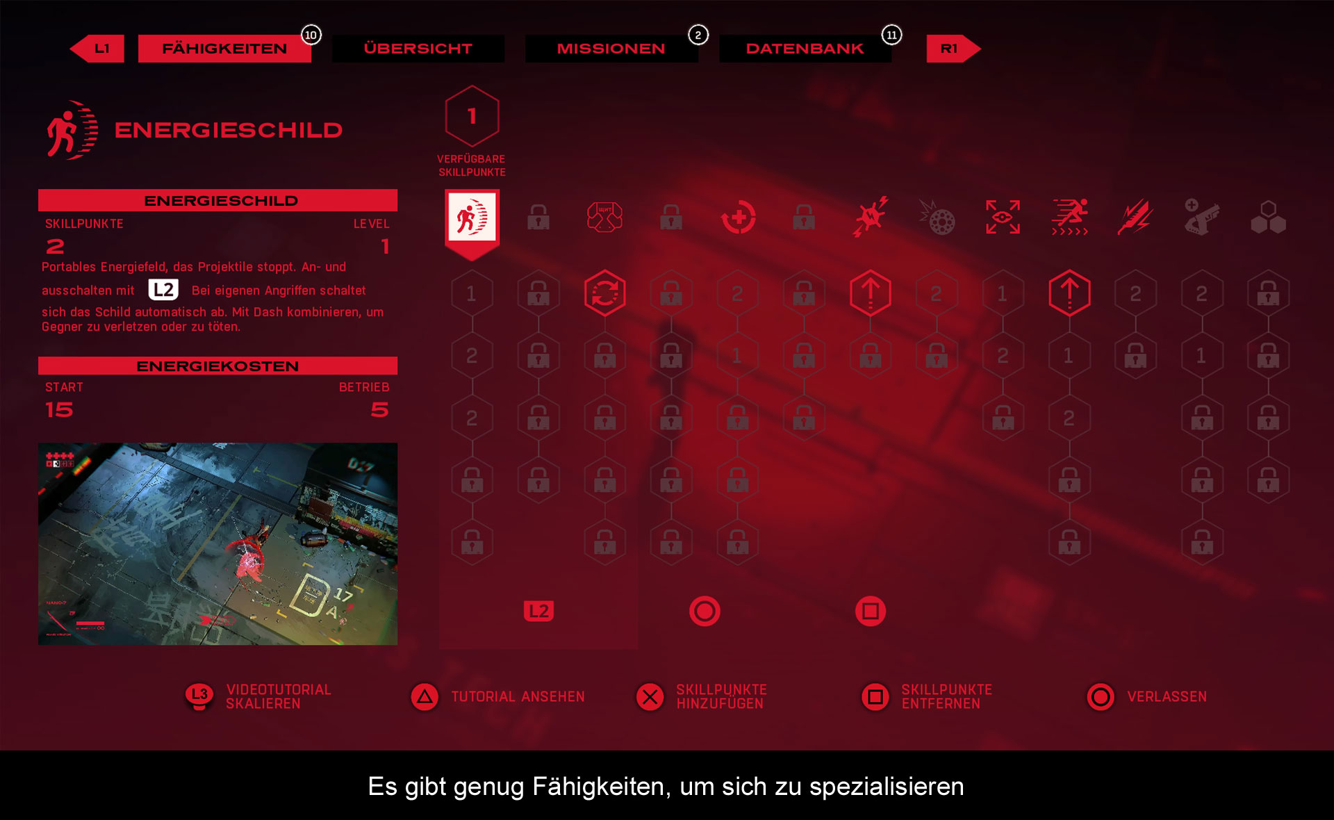 Von denen sind manche nützlicher als andere, aber fast alle lassen sich hochstufen. In einem Spielverlauf kann man übrigens nicht alle Fähigkeiten freischalten, dafür darf man die Punkte jedoch jederzeit neu verteilen. Aber was hat das Spiel so im Angebot? Da gibt es zum Beispiel das energiefressende Schutzschild, eine Blendgranate, die Gegner betäubt (zum Ende recht nützlich), dann ein „Energie in Lebenskraftumwandler“, Erhöhung der Munitionskapazität und Haltbarkeit von Nahkampfwaffen und natürlich Upgrades für die Dash-Funktion. Das Gamepad ist jedenfalls voll belegt! In den Kämpfen ist man deswegen auch mal leicht überfordert, denn durch Kill-Combos wechselt das Spiel in eine Art Zeitlupenmodus, in dem man quasi von Gegner zu Gegner springen kann und denen im Nahkampf den Garaus macht. Wenn dann überall noch alles Mögliche explodiert und auch die Feinde herumdashen, verliert man schnell den Überblick und nutzt selten das volle Potential an Fähigkeiten. Hier wäre weniger mehr gewesen, oder aber es hätte mehr Übersicht und weniger Zeitlupe gebraucht. Andere Spiele in diesem Genre machen das jedenfalls deutlich besser.