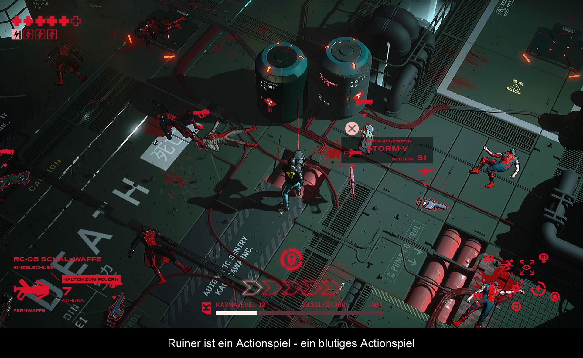 Cyberpunk war und ist schon immer eine Sache von Stil gewesen. Die Stimmung muss passen und dazu zählen neben einem starken elektronischen Soundtrack auch eine distinktive Optik. Beides wird in „Ruiner“ geboten. Und manches erinnert verdammt stark an den Anime (und nicht den schwurbeligen Realfilm) „Ghost in the Shell“ – nur ein paar Nuancen düsterer – realistischer eben. Das beeindruckt, auch wenn durch die Farbwahl (primär rot und schwarz) ein wenig die Abwechslung flöten geht und die Umgebungen sich zu stark ähneln. Doch damit kann man leben – zumal das Spiel in fünf Stunden locker durchgespielt ist. Ansonsten läuft der Titel auf PS4 und PS4 Pro recht gut, hier und da gibt es jedoch kleine Nachladeruckler und der Soundmix hätte etwas kräftiger ausfallen dürfen. Die paar Schnitzer in der Übersetzung oder besser gesagt, die Bildschirme die nicht übersetzt wurden, nimmt man gelassen hin. Es gibt Schlimmeres.