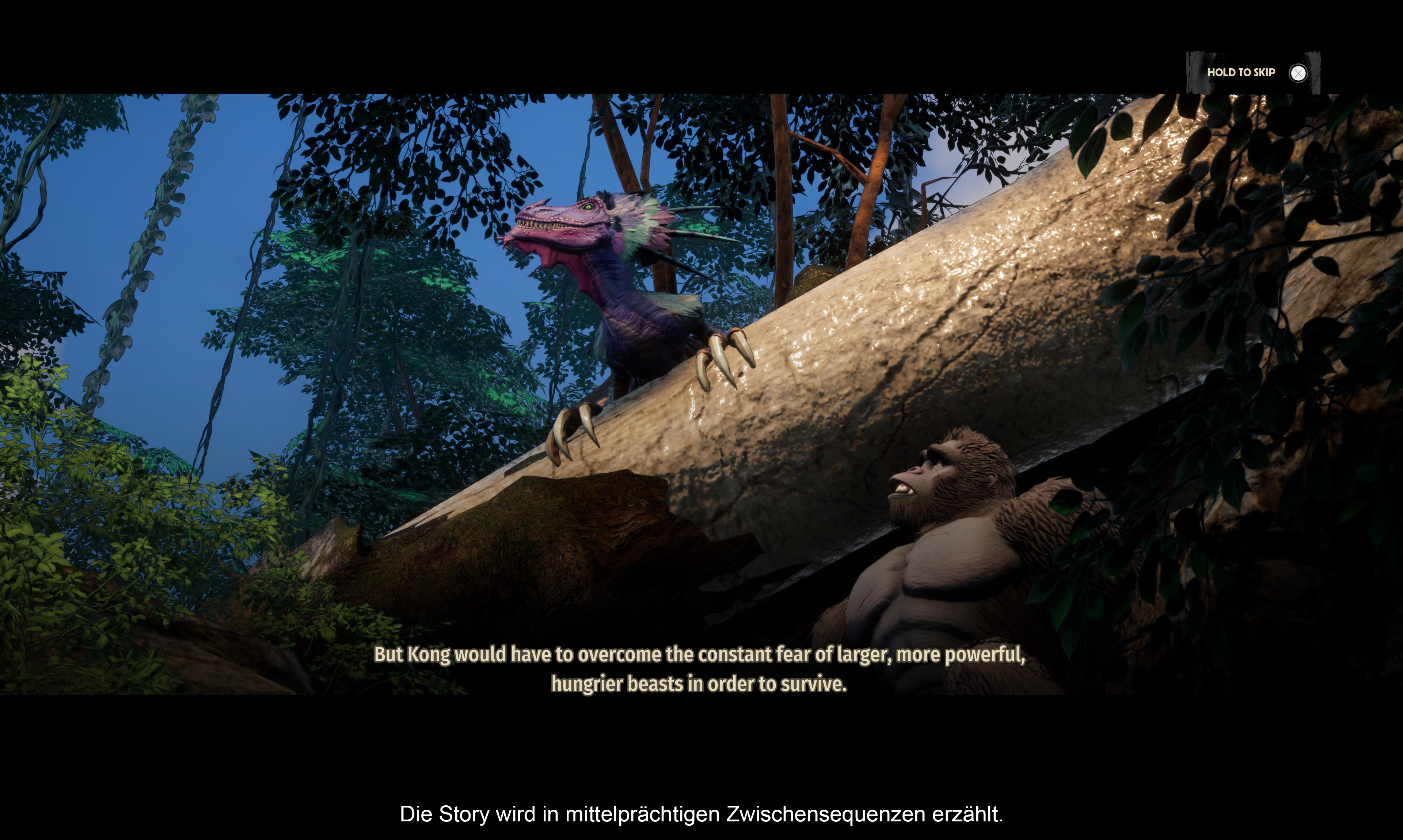 Das Spiel beginnt zunächst mit einem Rückblick in die Vergangenheit von King Kong. Als junger Affe musste dieser nämlich mit ansehen, wie seine Eltern den Kampf über die Herrschaft von Skull Island gegen einen mächtigen Dinosaurier verloren haben und dabei ums Leben kamen. Verstört von den Ereignissen, die sich vor seinen Augen abgespielt haben, zieht es den jungen Kong in die Tiefen des Dschungels, wo er Tagein und Tagaus ganz alleine um sein Überleben kämpft. Doch eines schicksalhaften Tages kreuzen sich erneut die Wege zwischen Kong und dem Mörder-Dino seiner Eltern, was in ihm das Verlangen nach Rache auslöst. Die Zeit des Versteckens ist endlich vorbei. Und dies ist auch der Moment, wo man als Spieler die Kontrolle über den Riesenaffen übernimmt.