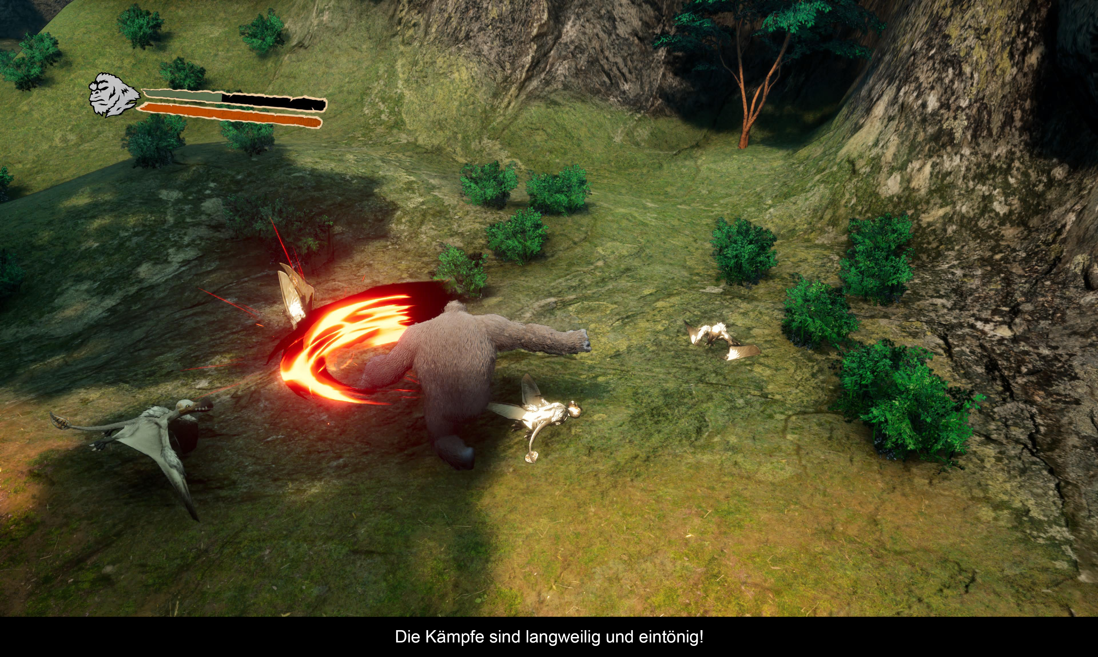 Was das Gameplay angeht, handelt es sich bei diesem Titel um einen klassischen 3rd Person Brawler. Ein Genre, welches es leider nicht mehr so oft gibt, aber sich vor allem in der PS2- und PS3-Generation durchaus großer Beliebtheit erfreute. Während man sich also durch die einzelnen Level bewegt, trifft man auf zahlreiche Gegner, die einem das Leben immer wieder etwas erschweren möchten, darunter auch kleine bis mittelgroße Raptoren, Spinnen oder Riesenkrabben. Auf die Gegner trifft man entweder im Level selbst oder in abgesperrten Kampf-Arenen, wo man zunächst alle Monster zur Strecke bringen muss, um weiter voranschreiten zu können. Die Level an sich sind relativ groß und verfügen hier und da über einige kleine Geheimnisse, die man entdecken kann, um verschiedene Boni im Hauptmenü freizuschalten. Kong selber verfügt über ein Repertoire an verschiedenen Prügel-Skills, welches man Genre-typisch erweitern und upgraden kann. Da es jedoch kein Level-System gibt, erhält man die notwendigen Skills-Points meist nach dem Besiegen von Endgegnern. Dennoch muss ich zugeben, dass die Standard-Prügelattacke stets die beste Waffe gegen die Monster war. Dennoch wurde ich nie wirklich mit dem Kampfsystem warm. Vor allem, weil man viel zu oft mehreren Gegnern auf einmal gegenübersteht und man nur mit sehr viel Mühe die Hitboxen der einzelnen Kontrahenten erwischt. Darüber hinaus sind die Monster auch relativ stark, wodurch die Kämpfe schnell zu einer echten Herausforderung werden können. Komischerweise gibt es auch nur einen Schwierigkeitsgrad, wodurch es auch keinen Ausweg für komplizierte Duelle gibt. Bei einem guten Gameplay wäre das ertragbar, aber bei diesem stumpfen und eintönigen Haudrauf-System ist es schon etwas schlauchend, wenn man einen Boss erneut begegnen muss. Immerhin sind die Checkpoints relativ fair verteilt, wodurch man beim Ableben nicht viel Zeit verliert. Dennoch muss man festhalten, dass das Gameplay heutzutage definitiv Keinen mehr vom Hocker hauen wird. Die Steuerung ist relativ steif und unpräzise. Und da kommt es dem Spiel leider auch nicht entgegen, dass es viel zu viele Plattforming-Passagen gibt, die ebenso wenig Spielspaß vermitteln, weil die Charaktersteuerung zu keiner Zeit irgendeine Art von Flow entstehen lässt. Darüber hinaus hat es auch nicht geholfen, dass ich beim Spiel auf einen Game-Breaking Bug gestoßen bin, wo sich mein Kong nach zirka eine Stunde Spielzeit in einer Berg-Textur eingeklemmt hat und sich nicht mehr befreien konnte. Und da der Speicherpunkt genau in diesem Moment lag, konnte ich mich auch nicht mehr aus dieser Situation befreien, wodurch ich zum Neustart gezwungen wurde. Bei anderen Spielen wäre das vielleicht noch ertragbar, aber angesichts des enorm eintönigen Gameplays, fand ich einen erneuten Start nur bedingt amüsant. Alles in allem konnte mich das Gameplay - und auch die Story - von Skull Island nur bedingt überzeugen. Die Idee, die Geschichte eines jüngeren Kongs zu erzählen, ist zwar lobenswert, aber die richtig schlecht inszenierten Zwischensequenzen tragen einiges dazu bei, dass man das Spiel sowie den namensgebenden Charakter nie wirklich ernst nehmen kann.
