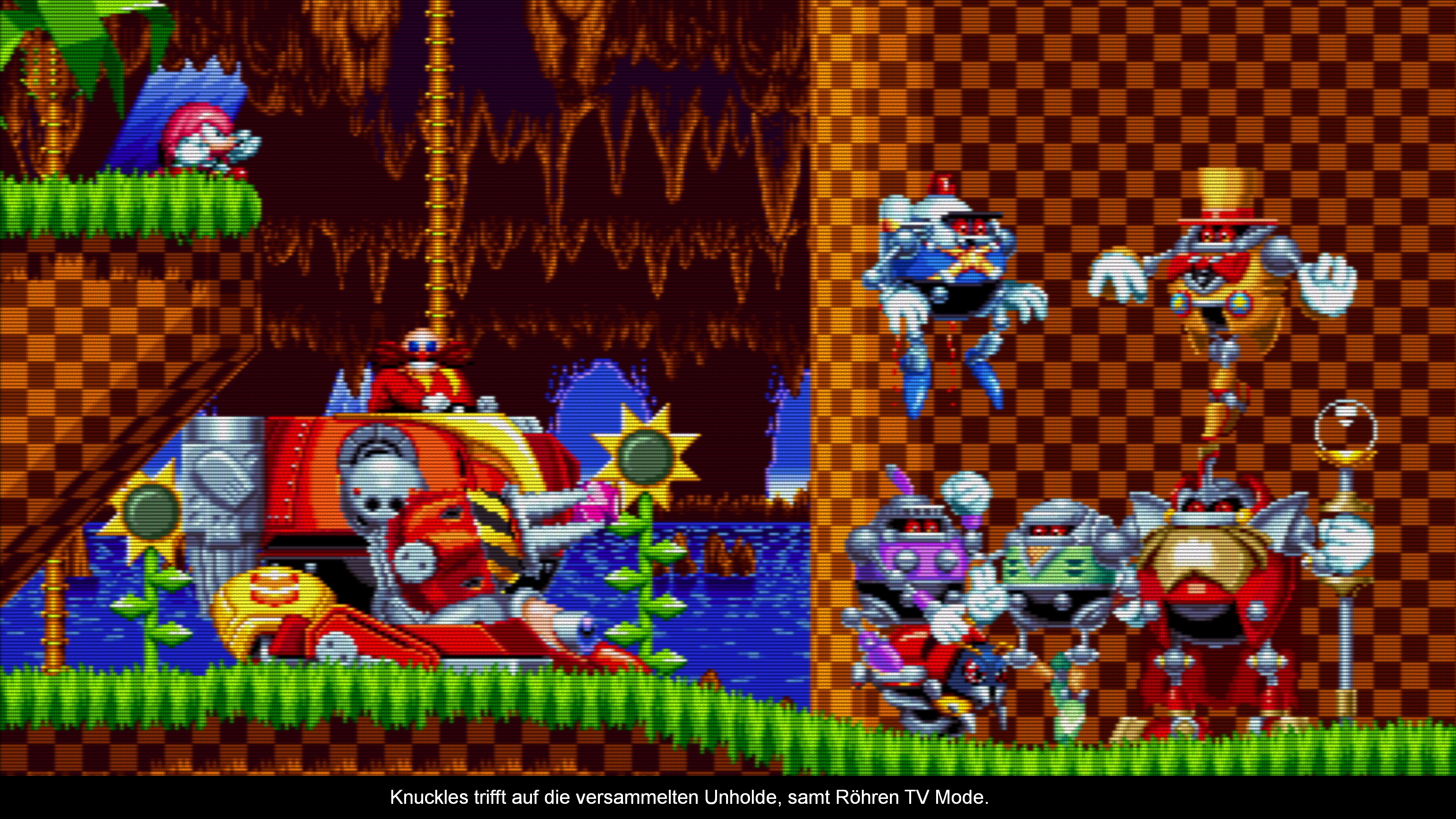 Sonic Mania ist dabei eine Art Best Of gepaart mit vielen coolen und sinnvollen Neuerungen. So wurden zwar allerlei Levels aus alten Sonic Spielen hier wiederverwertet, doch wurden diese in allen Richtungen erweitert, so dass es viel mehr zu entdecken gibt. Dies geschah dabei mit einer Liebe zum Detail, dass es nicht aufgesetzt oder fehl am Platz wirkt und man glaubt eher, dass die Level schon immer so gewesen sind. Auch wurde der Speed von Sonic (endlich wieder mit normalen Proportionen am Start) an die alten Spiele angelehnt, was für mehr Kontrolle sorgt und nicht nur Blindflüge zur Folge hat. Sonic war früher nie ein glücksabhängiger Raser, zu dem wurde er erst in den letzten Jahren gemacht. Weiterhin sollte man dankbar sein, dass die hässliche Lock On Funktion beim Beseitigen von Gegnern nicht mehr dabei ist. Neben den bekannten Szenarien gibt es aber auch viele neue Schauplätze, welche sich ebenfalls perfekt ins Spiel einfügen. Dies gilt für die Endgegner ebenfalls, welche zudem zahlreicher und auch abwechslungsreicher daherkommen. Einmal führt die hau drauf Methode zum Erfolg, mal benötigt man Timing, mal scrollt das Level automatisch, mal muss man die Umgebung mit einbeziehen und mal spielt man gegen Dr. Robotnik (und ja, es heißt Robotnik und NICHT Eggman!) eine Party "Dr. Robotniks Mean Bean Machine". Erweitert wurden auch die Zwischensequenzen, welche zwar zahlreicher aber nicht wirklich aussagekräftiger sind. Die Story bleibt wie gewohnt nur ein Alibi. Erkunden kann man dabei die Levels entweder mit Sonic, Tails, Knuckles oder als Team Sonic & Tails. Während man mit Sonic natürlich eher schneller durch die Level rennt, kann man mit Knuckles kletternd und schwebend und Tails begrenzt fliegend die riesigen Abschnitte besser erkunden. Jeder Charakter hat also seine Eigenheiten und erfordert unterschiedliche Spielweisen. Mit Knuckles und Tails findet man auch eher die coolen Details und Verstecke, als mit Sonic. So zum Beispiel die Zutritte in die Bonus Stages. Neben der normalen und bekannten Bonus Stage aus Sonic 3, welche man über die Laternen erreicht und wo Sonic über eine große Kugel rennt und kleine blaue Kugeln einsammeln muss (man wie habe ich dies schon vor über 20 Jahren gehasst!), wurde für Sonic Mania noch eine neue Stage kreiert, welche ein wenig an die aus Sonic CD erinnert. Hier rennt man in Verfolgeransicht über eine Rennstrecke und versucht ein UFO zu fangen. Leider fehlt die ikonische Bonus Stage aus Sonic 2, wo man durch eine Röhre rast.