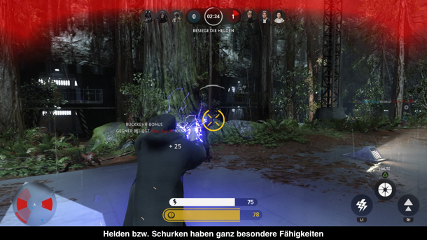 Da diese Modi jedoch nur bedingt Langzeitmotivation bieten, liegt der Fokus des Spiels ganz klar auf dem Multiplayer-Modus. Hier darf man aus insgesamt neun Spielmodi auswählen, die je nach Modus von 6-40 Leuten gespielt werden können und immer spielt ihr entweder auf der Seite der Rebellen oder des Imperiums. Dabei könnt ihr euren Charakter auch individualisieren. Es stehen nicht nur zahlreiche Spielfiguren zur Verfügung, die ihr alle freischalten müsst, sondern auch Power Ups. Denn im Kern wählt ihr eine Waffe für eure Figur und habt dann drei Sternenkarten. Diese Karten könnt ihr im Kampf taktvoll einsetzen, um z.B. eine Granate werfen zu können oder kurzzeitig ein Jetpack einzusetzen. Nach dem Einsatz muss die Karte bzw. die Fähigkeit erst wieder aufgeladen werden, bevor man sie wieder einsetzen kann. Leider habt ihr zu Beginn des Spiels nur eine Waffe und sonst nichts und müsst alles weitere erst freischalten. Das kann in manchen Situationen zu einem Nachteil gegenüber erfahrenen Spielern führen, da vor allem das Jetpack recht hilfreich ist, aber erst spät freigeschaltet wird. Selbst Waffen muss man alle freischalten, wobei die Wahl der Waffe nur bedingt Einfluss auf euren Spielfluss hat. Denn in den meisten Fällen tut es auch die Standardwaffe, da sie wie alle anderen auch selbst auf lange Distanzen sehr präzise ist. Deshalb ist es nicht verwunderlich, dass auf den zum Teil recht offenen Karten viele Camper unterwegs sind, die nur auf darauf warten, dass ihr durch das Bild lauft.