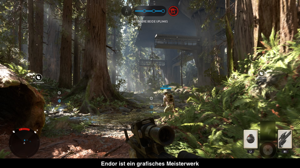 Wenn Star Wars draufsteht, erwartet man auch im Inneren Star Wars und hier muss man DICE großes Lob aussprechen. Denn die Planeten sehen ihren Vorbildern zum Verwechseln ähnlich und sehen einfach umwerfend aus. Texturen sind gestochen scharf, Aliasing gibt es kaum und dass das Spiel „nur“ in 900p läuft, merkt man kaum. Da man die 60 Bilder pro Sekunde auch fast stabil halten kann, nimmt man die etwas geringere Auflösung gerne in Kauf. Vor allem Endor sieht umwerfend aus mit seiner dichten Vegetation, wo sich Büsche sogar bewegen, wenn man hindurch läuft. Sie bieten sogar taktische Vorteile, weil man sich darin fast verstecken kann. Gleiches gilt auch für den Sound, den man perfekt nachahmen konnte. Jeder Schuss, jedes Fahrzeug klingt wie in den Filmen. Zur überzeugenden Technik gesellt sich dann auch noch ein schnell und zuverlässiges Matchmaking-System hinzu, was euch schnell in die Spiele bringt.