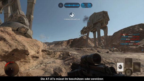 Während ihr aber in der Schlacht seid, könnt ihr auch einzelne Power-Ups einsammeln. Mal ist es ein Raketenwerfer, aber hin und wieder bekommt ihr ein Fahrzeug oder könnt sogar Held sein. Bekommt ihr ein Fahrzeug, wie z.B. einen X-Wing oder einen Walker, funktioniert es ähnlich wie ein Drohne. Euer Kämpfer holt ein Pad heraus und steuert darüber das Gefährt. Bekommt ihr aber die Möglichkeit ein Held zu sein, wechselt direkt die Spielfigur und ihr dürft euch z.B. als Luke Skywalker durch die Gegnermassen kämpfen. Insgesamt gibt es sechs Helden, je drei pro Seite. Leider sind nicht alle gleich nützlich. Allen voran Darth Vader und Luke Skywalker haben in einigen Kämpfen das Nachsehen, weil sie nicht auf Distanz kämpfen können. Dabei gibt es relativ selten Situationen, in denen euch ein Gegner direkt vor die Flinte läuft. Immerhin kann man mit den Lichtschwertern einige Schüsse abwehren, jedoch nicht beliebig lange. Weitere Helden sind der Imperator, Boba Fett, Leia und Han Solo. Alle Helden treffen im Spielmodus Helden vs. Schurken aufeinander. Darin treten zwei kleine Teams gegeneinander an und Ziel ist es die drei Helden der Gegnerseite als erstes zu töten. Unterstützt werdet ihr dabei von zwei normalen Soldaten und pro Runde wechseln Helden und Soldaten, damit jeder mal in die Rolle des Helden schlüpfen darf. Leider wird insbesondere hier deutlich, wie unterschiedlich nützlich die Helden bzw. Schurken sind. Allen voran Boba Fett ist in den Händen des richtigen Spielers nur sehr schwer zu stoppen. Seine Waffe ist über lange Distanzen unglaublich präzise und stark und dank des Jetpacks kann er gut aus Situationen fliehen bzw. sich einen Ortsvorteil verschaffen. Auf Tatooine wird das deutlich, wenn in nahezu jeder Runde Boba Fett auf dem Zeppelin steht und von oben in Ruhe alle anderen ausschalten kann, weil niemand an ihn herankommt. Ein weiterer spezieller Star Wars Modus ist die Jägerstaffel, in der man mit 20 Luftschiffen pro Seite gegeneinander kämpft. Zur Wahl stehen natürlich Schiffe, wie X-Wings oder TIE-Fighter. Mit etwas Glück kann man aber auch z.B. in einen Millennium Falcon steigen. Glück ist hier das richtige Wort, denn auch ihn erhält man durch ein Power-Up, welches man im Flug einsammeln muss. Sitzt man aber erst einmal in diesem starken Luftschiff, hält einen kaum etwas mehr auf. Man selbst hält unheimlich viel Schaden aus und teilt dabei auch noch mehr aus. Nur die perfekte Koordination des Gegners hilft hier. Leider ist das selten der Fall und so hat es schon starken Einfluss darauf, welche Seite zuerst ihr Power-Up ins Spiel bringt, was Sieg oder Niederlage betrifft. Ähnlich unbalanciert ist der Walker-Modus. Hier laufen zwei AT-ATs auf ein Ziel zu und ihr müsst sie nun entweder beschützen oder besiegen. Während in der Beta nun meist das Imperium gewonnen hat, weil es sehr schwer war den Walkern Schaden zuzufügen, hat sich das Blatt gedreht. Die Rebellen gewinnen relativ oft, weil man in der letzten Phase reichlich Schaden verabreichen kann. Ansonsten stehen natürlich auch Klassiker, wie Team-Deathmatch und andere Modi zur Verfügung. Ein anderes Problem sind die Spawn-Punkte. Diese entziehen sich jeglicher Logik. Mal wird man ans andere Ende der Karte geschickt, obwohl die Ziele wo anders sind und dann laden manche Spawn-Punkte dazu ein, dass Camper nur auf einen warten. Hier muss DICE unbedingt nachbessern.
