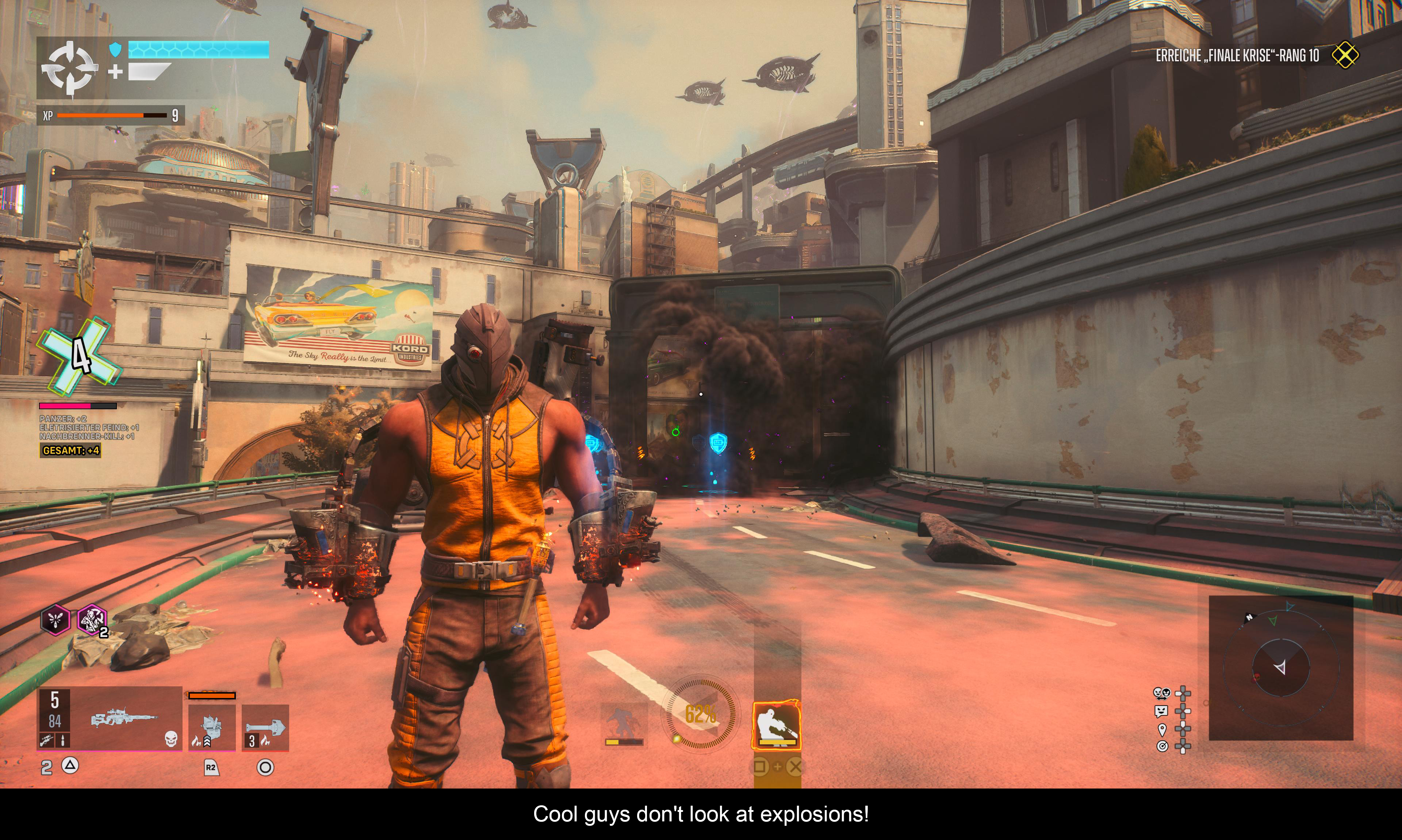 Gameplaytechnisch hat man sich weit von den „Batman: Arkham“ Spielen entfernt. Einzig bei Harley Quinn findet man noch Spuren davon wieder. Jeder Schurke verfügt über zwei Waffen (Maschinengewehr, Pistole, Scharfschützengewehr, etc.) und eine Nahkampfwaffe. Somit ist das Spiel klar als Third Person Shooter einzuordnen. Um sich von der Konkurrenz abzusetzen, legt man hier jedoch mehr Wert auf Mobilität. Alle Figuren verfügen über eigene Fortbewegungsmöglichkeiten. Deadshoot hat sein Jetpack, Boomerrang die Speedforde, Harley Batmans Greifhacken und King Shark springt durch die Gegend. Ihr versucht so, die Gegner auszumanövrieren und euch aus der Schusslinie zu bringen. Danach wird die Verteidigung des Gegners gebrochen und Schaden zugefügt. Die Nahkampfwaffe kommt erst zum Zug, um die eignen Schilde wieder aufzufüllen. Hat man einen Gegner entsprechend geschwächt, kann man einen Schild sammeln. Dadurch wird man gezwungen, mit dem Gegner auf Tuchfüllung zu gehen, aber auch immer mobil auf dem Schlachtfeld zu bleiben. Sofern man die komplizierte Steuerung einmal verinnerlicht hat, entsteht ein interessanter Rhythmus. Ziel ist es, den Kombo Zähler immer oben zu halten, damit bestimmte Statuseffekte ausgelöst werden und man seine Finisher und Spezialattacken einsetzen kann. Das Rad wird hierbei zwar nicht neu erfunden, aber zumindest macht es Spaß. Wer nun das grandiose Kampfsystem aus den Batman Spielen sucht, muss zu den alten Teilen greifen. Das Freeflow System existiert in diesem Titel nicht. Einzig beim Kontern wurde sich an den alten Spielen orientiert.