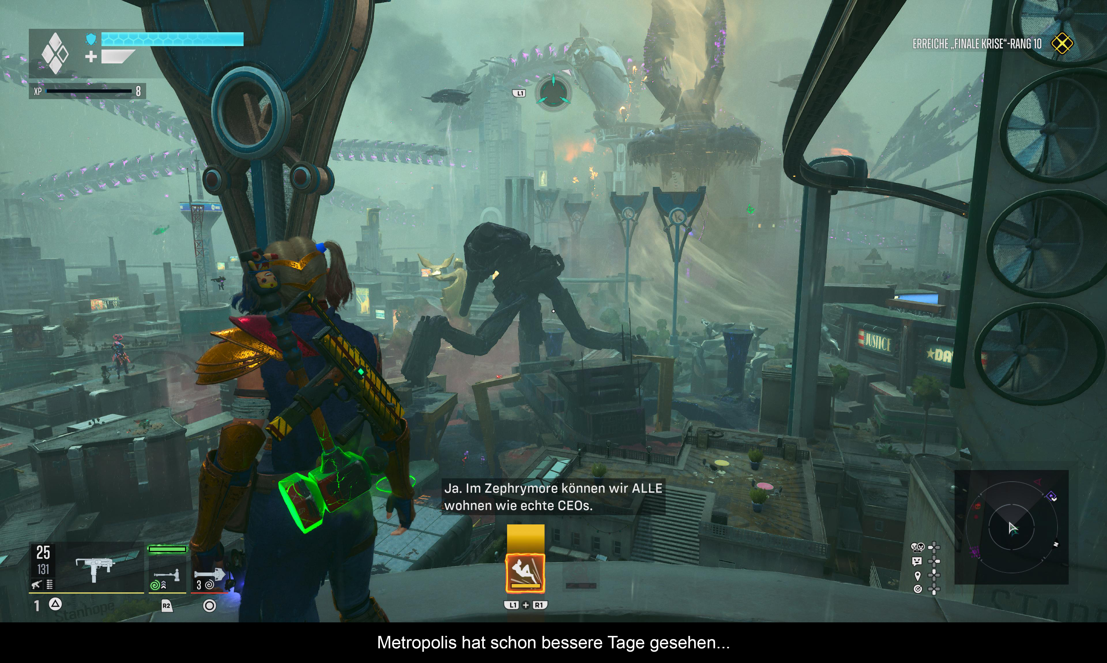Als Kulisse dient das berühmte Metropolis aus den Superman Comics, welches von Brainiacs Truppen belagert wird. Zwischen Häuserschluchten und Straßen kämpft man gegen diese Gruppen. Innenräume kann man zwar auch besuchen, nur dienen diese lediglich für die Handlung. Kenner werden in der augenscheinlich leeren Stadt, viele Anspielungen auf bekannte Figuren und Orte finden. Das macht es anfangs doch unterhaltsam, diese Welt zu erkunden. Der Spaß beginnt jedoch deutlich abzuflachen, sobald man versteht, dass man jede Menge repetitive Aufgaben erledigen muss. Denn die Handlung scheint nur aus denselben vier Missionstypen zu bestehen. Diese sind zwar dem Szenario immer etwas angepasst, bieten aber kaum Abwechslung. Im Grunde muss man immer einen Sender beschützen, Zivilisten evakuieren, bestimmte Stellungen zerstören, oder ein Fahrzeug eskortieren. Auch die Gegnerauswahl ist mehr als überschaubar, da sie aus typischen Nah- und Fernkämpfern, sowie dem obligatorischen Tank besteht. Spätere Abschnitte führen zwar neue Typen ein, aber die sind mehr lästig, als fordernd (unsichtbare Scharfschützen). Die Bossgegner bieten zumindest etwas Abwechslung, sind aber in Summe zu wenige, um aus der Monotonie auszubrechen. Daneben bieten noch die Support-Charaktere spezielle Aufgaben, aber auch hier werden die selben Missionstypen mit unterschiedlichen, teils unfairen, Modifikationen und steigenden Schwierigkeitsgrad aufgeboten. Beim Missionsdesign wäre deutlich mehr Abwechslung möglich gewesen! Am Ende jeder Mission sackt man die üblichen Erfahrungspunkte und eine Belohnung in Form von zufälliger Ausrüstung ein, welche sich an Hand der Seltenheit unterscheidet. Hier greift das allseits bekannte Beutekonzept, wie man es aus „Diablo“, „Destiny“ oder „Borderlands“ kennt. Wer trotzdem die Welt weiter erkundet, findet Riddlers Rätsel, bei denen es um das Erraten von bestimmten Gebäuden geht. Oder man darf Trophäen suchen und Hindernisparcours zu bestehen. Durch diese Sachen werden auch die wenigen zusätzlichen Kostüme für die Spielfiguren freigeschaltet.