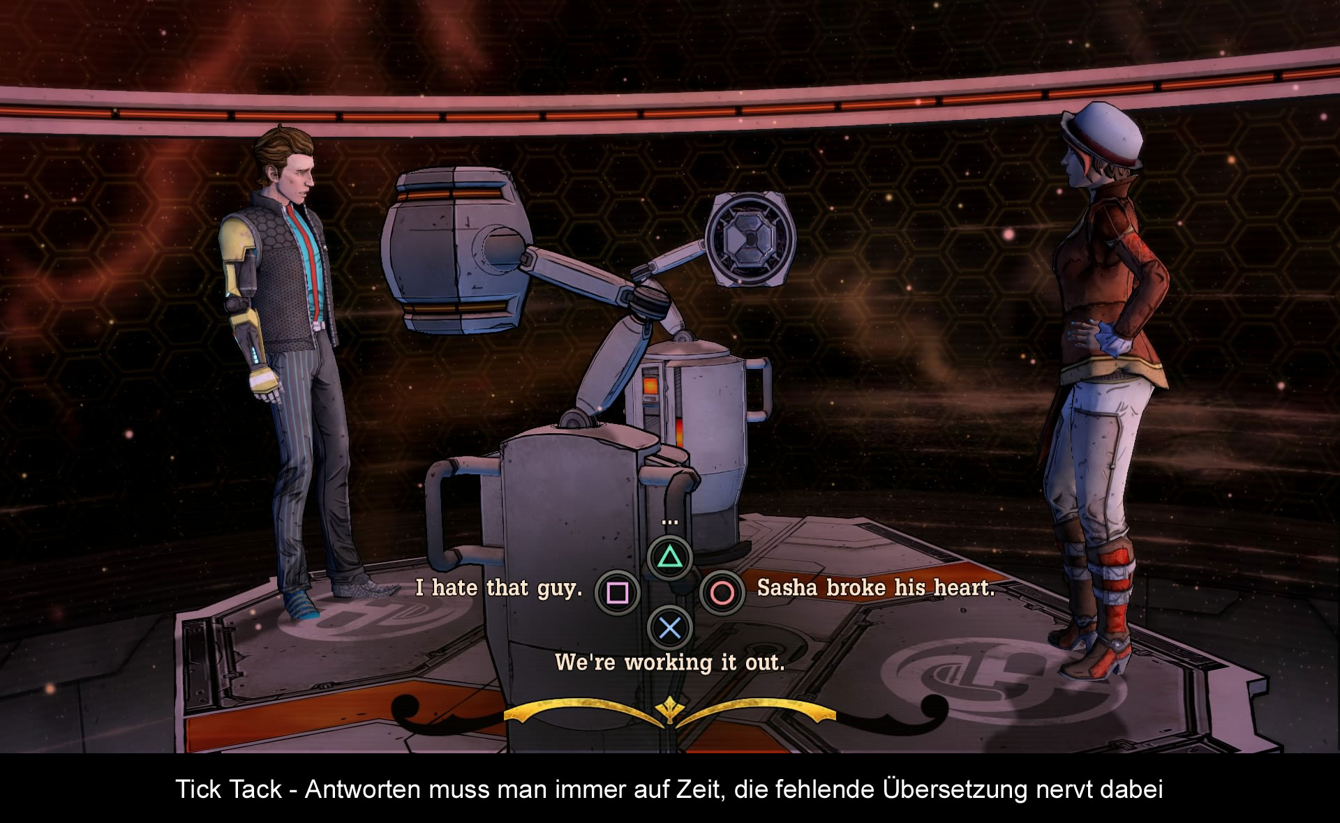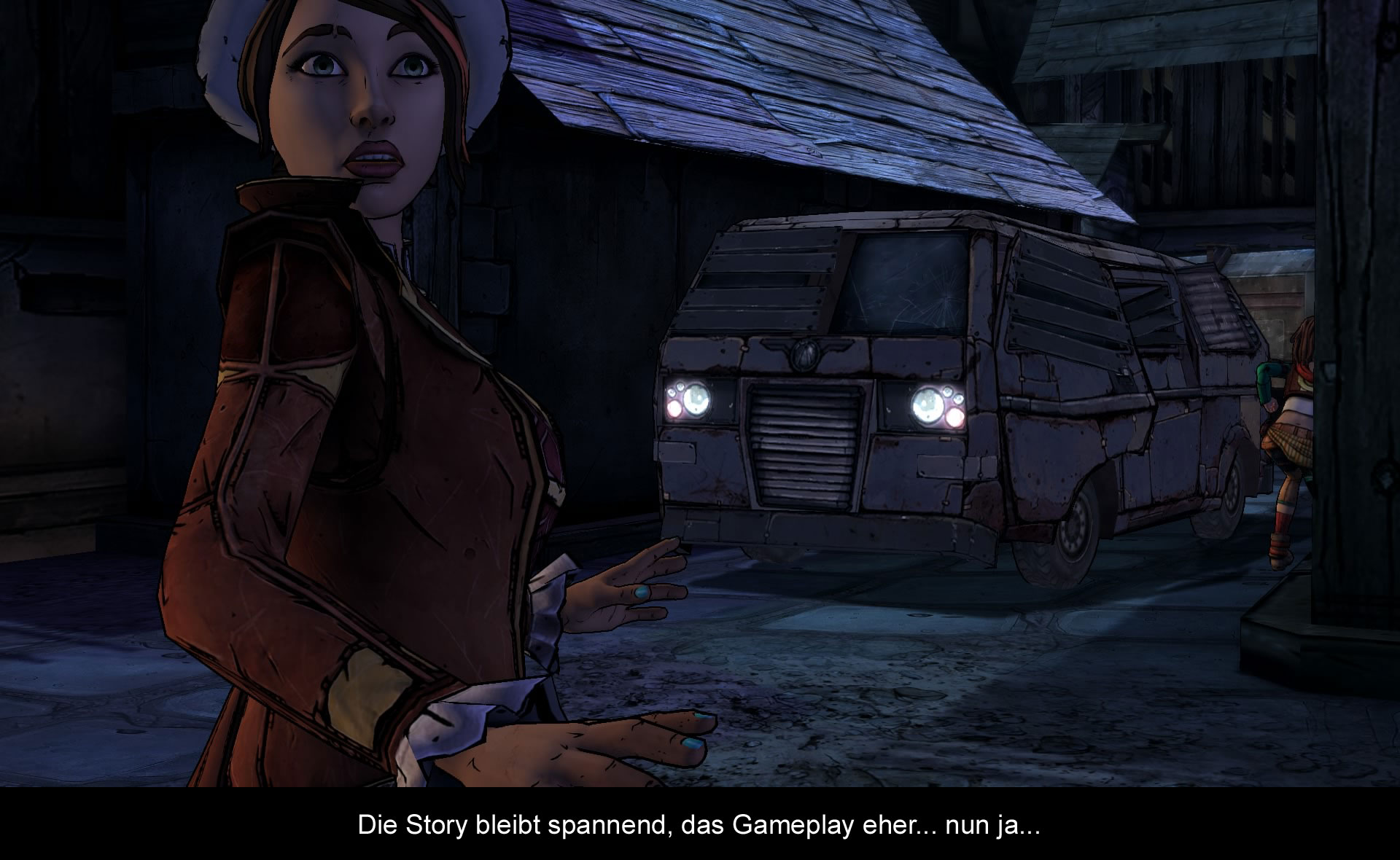 Wer jetzt große Neuerungen im Gameplay erwartet, wird enttäuscht. Noch immer ist hauptsächlich Reaktion gefragt. Egal ob bei den vier Antwortmöglichkeiten oder bei den schnellen Quick Time Events während den Action-Szenen ist. Großartig hat sich hier zu anderen Telltale Spielen nichts geändert. Wie der Entwicklername schon sagt, will man in erster Linie eine Geschichte erzählen. Man muss den Amerikanern zwar zugutehalten, dass sie die Welt von „Borderlands“ verstehen, aber erstaunlicherweise kaum Möglichkeiten finden, die bekannte Loot Mechanik einzubauen. Stattdessen gibt es immer wieder kleine Verweise auf das Hauptspiel. Bei Scooter kann man seinen Truck lackieren lassen und Fionas Waffe wurde nun mit Elementarkugeln bestückt. Auch Rätselelemente findet man kaum, und diejenigen, die noch am ehesten darunter fallen würden, sind es nicht wert, Rätsel genannt zu werden. Das Gameplay präsentiert sich also gewohnt geradlinig und bietet keine Möglichkeit die Welt frei und in Ruhe zu erkunden. Etwas zu übersehen, ist daher unmöglich. Gegenüber Episode 1 gibt es auch keine technisch Änderungen. Grafik und Ton sind noch immer ordentlich in Szene gesetzt! Bezüglich möglicher Bugs, kann ich nur sagen, dass mir nichts aufgefallen ist. Möglicherweise scheint man bei Telltale Games endlich den größten Kritikpunkt erkannt und ausgemerzt zu haben!