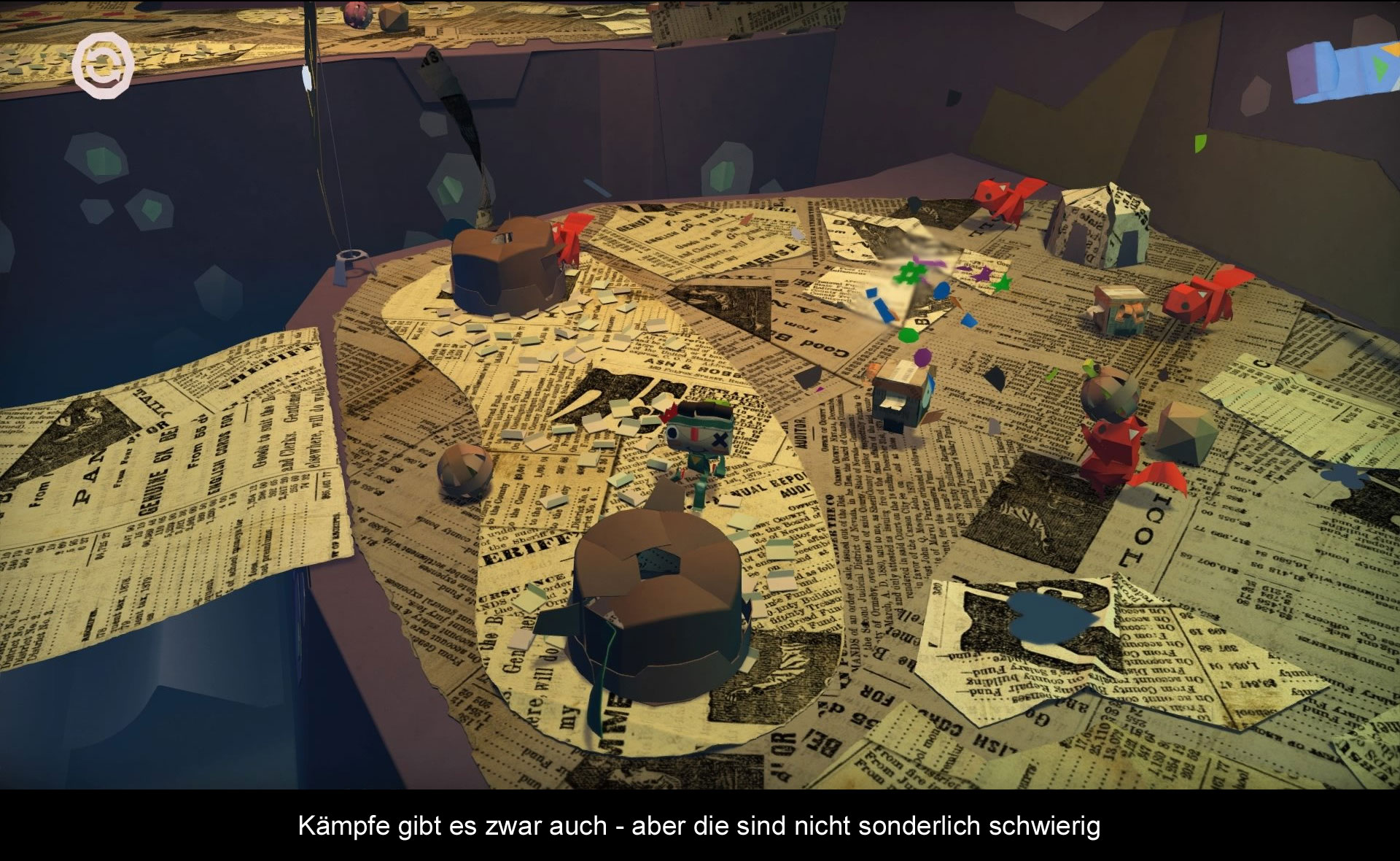In Tearaway: Unfolded dreht sich alles um Iota bzw. Atoi, eine zum Leben erwachte Nachricht, die man nun zum „Wesen“ bringen muss, was sich am Himmel als Sonne tarnt. Dabei durchlebt man zahlreiche Abenteuer mit dem kleinen Iota, denn der Weg ist natürlich kein leichter. Die Schnipsel haben sich nämlich zum Ziel gesetzt die bunte Welt mit öden Zeitungsausschnitten zu überschatten und die Kontrolle an sich zu reißen. Das Zurückschlagen der Schnipsel gehört also ebenfalls zu euren Aufgaben und während des Abenteuers trefft ihr auf Eichhörnchenkönige, Schweine, Wendiges und allerlei andere Figuren. Die Geschichte ist sehr niedlich erzählt und bietet gute 10 Stunden Spielspaß.