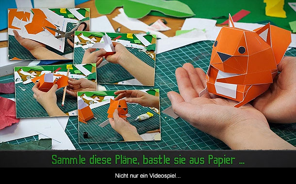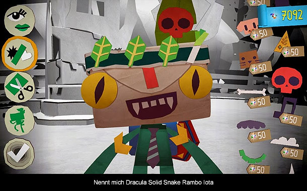 Doch genug von diesen kleineren Schnitzern im Gameplay, den Tearaway will vor allem bei Kreativität Punkten und das Meistert dieses Spiel. Schon früh bekommt eine Kamera geschenkt, um Objekte zu fotografieren. Immer wieder findet man in den Levels weiße Objekte die es zu fotografieren gilt. Hat man ein gutes Foto geschossen wird man aufgefordert das Spiel mit seinem Tearaway.me Account zu synchronisieren. Der Clou hierbei ist, dass ihr auf dieser Webseite diese Modelle freischalten und auf Papier ausdrücken könnt um diese zu basteln. Wer will kann danach ein Foto machen und die eigene Kreation mit der Community teilen. Wer lieber die virtuelle Kreativität nutzt, hat mit der Option der Bastelmappe die Möglichkeit verschiedene Objekte für die Bewohner der Papierwelt zu schaffen. Sei es eine Krone für ein Eichhörnchen oder eine Schneeflocke. Euch ist es überlassen wie dies aussehen soll. Diese kleinen Dinge findet man immer wieder in den Levels und die verleihen jedem Spieldurchgang seine Individualität. Auch der Kurier lässt sich voll und ganz anpassen. Schneidet etwas aus und klebt es auf ihn. Kreativität wird in diesem Spiel großgeschrieben und ihr selbst legt fest wie ihr diese Welt gestallten möchtet.