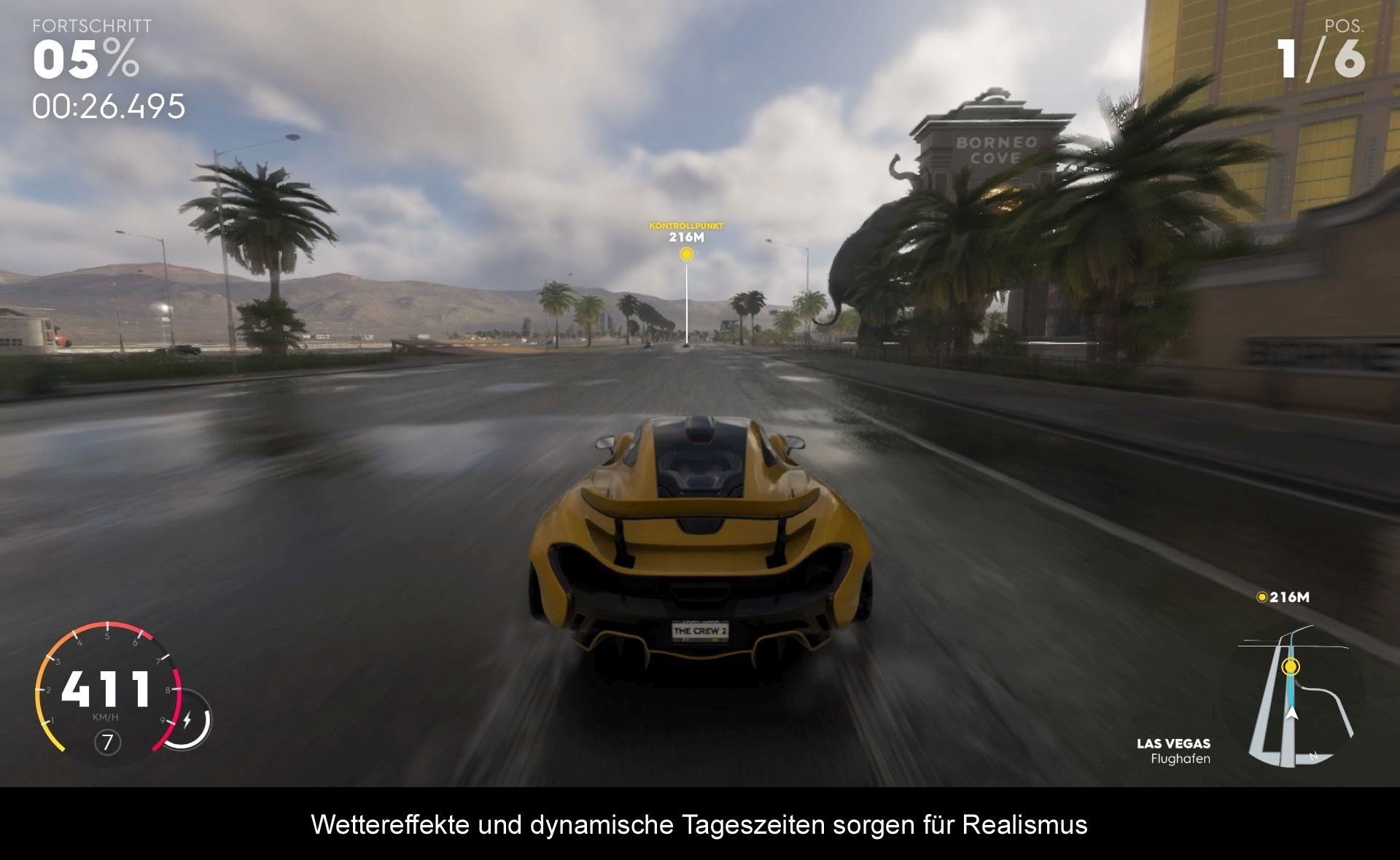 Das Positive vorweg: Es flimmert nix mehr in „The Crew 2“. Das Bild wirkt sehr ruhig und mitunter sehr atmosphärisch, insbesondere bei Regen. Auch finde ich, die einzelnen Regionen der USA haben mehr Charakter bekommen und unterscheiden sich visuell deutlicher. Dafür kommt es mir so vor, dass die Spielwelt kleiner ausfällt und es weniger Straßen gibt. Das Gefühl kann allerdings auch täuschen, da die ganze Karte von Anfang an freigeschaltet ist und man diese nicht erst Schritt für Schritt aufdecken muss. Die Bildrate läuft übrigens recht stabil und nur selten kommt es zu kleinen Rucklern oder minimalem Tearing (meistens nur bei Rennen in Städten auf der normalen PS4). Das Geschwindigkeitsgefühl ist übrigens sehr gut, sogar bei den wahnsinnigen Hypercars. Das hat aber seinen Preis: Pop-ins / Fade-Ins, bei denen die Details erst spät ins Bild „ploppen“ sind an der Tagesordnung. Umso schneller man unterwegs ist, umso stärker fällt das auch auf. Ein weiteres Problem ist die schlechte Sichtbarkeit der Strecken bzw. der Streckenführung. Dadurch ist man immer wieder gezwungen auf die Karte zu schauen, damit man sich nicht verfährt und den nächsten Checkpoint verpasst. Andere Spiele lösen diese Problematik weitaus besser. Ähnlich verhält es sich mit den Tageszeiten – nachts braucht man im Prinzip nicht fahren, denn es ist alles stockdüster – was an sich in der Wildnis zwar realistisch wäre, aber dann sollten die Scheinwerfer der Autos auch funktionieren und einen ordentlichen Lichtkegel werfen, damit man auch was Erkennen kann. Mehr oder minder existieren diese Umstände auch auf der PS4 Pro, mit einem gewaltigen Unterschied – dort sieht das Spiel deutlich besser und höher aufgelöst aus. Also wenn ihr die Möglichkeit habt, spielt es auf dieser Hardware. In Sachen Sound fallen nur die mäßigen deutschen Sprecher negativ aus. Der Rest passt, so wummern die Motoren wuchtig und fett aus den Boxen, oder man genießt die Natur dank herrlicher Umgebungsgeräusche. Wenn man das Radio einschaltet, warten zudem zahlreiche Stationen auf den Hörer mit verschiedenen Genres - mein Liebling ist übrigens der Ambient-Kanal.