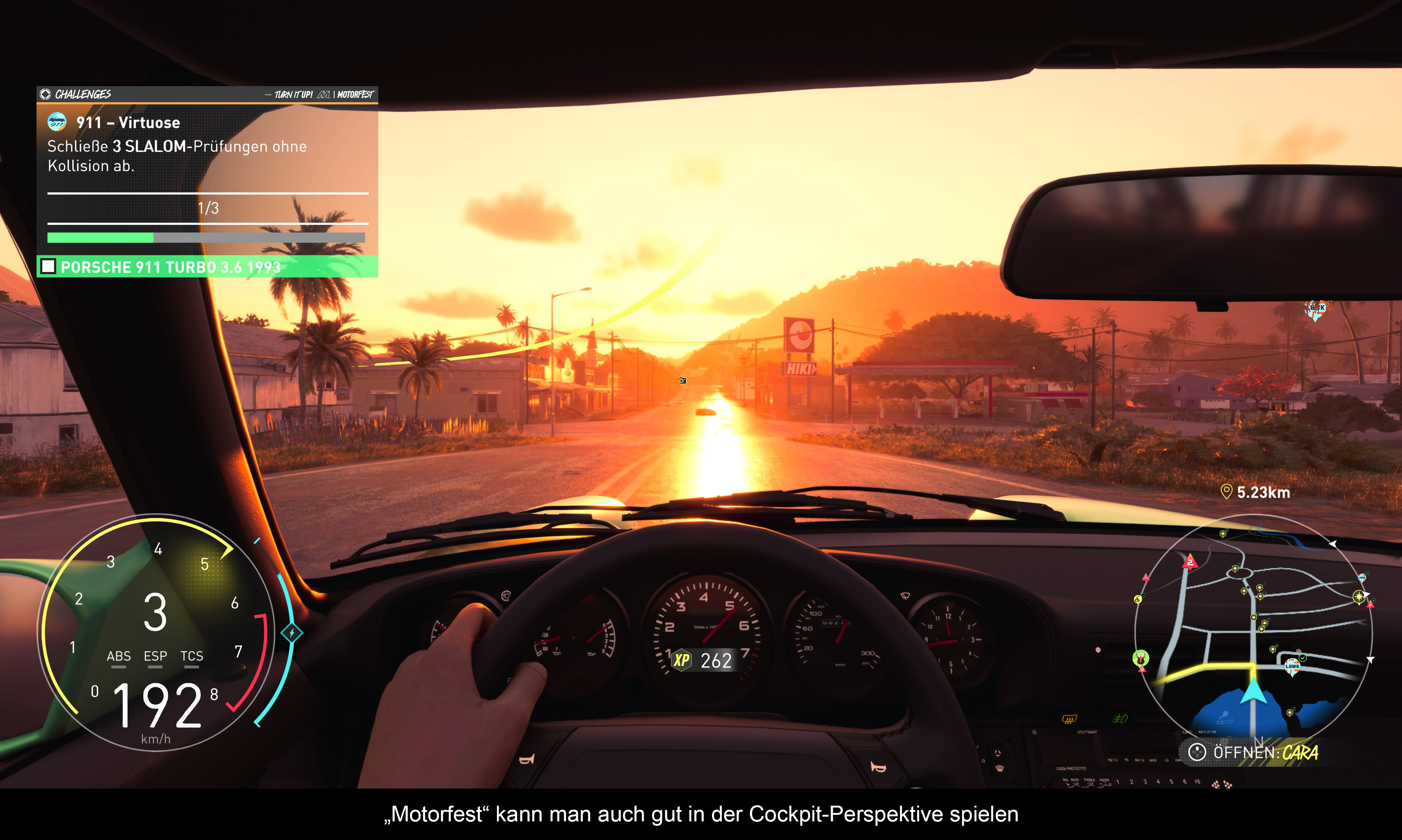 „Motorfest“ bietet die Auswahl zwischen zwei primären Grafikmodi. Qualität nutzt 4K Auflösung und ruckelige 30fps, während Performance die Auflösung drückt, dafür aber 60fps auffährt. Somit ist der zweite Modus die vernünftigere Wahl. Die niedrigere Texturauflösung sieht man zwar, aber dennoch kann das Gesamtbild überzeugen. Leider trifft das nicht ganz auf die Framerate zu: Mikro-Ruckler und Einbrüche bei städtischen Rennen lenken vom Spielgeschehen ab. Es ist aber nicht so, dass der Titel dadurch unspielbar wird, ich hätte nur eben ein wenig mehr erwartet. Bei den Darstellungsmodi gibt es ebenfalls zwei Wahlmöglichkeiten: sRGB und HDR 10, letzteres verschreckt aber mit einer missratenen Grundeinstellung. Justiert man die Schieberegler jedoch neu, dann bekommt man ein wesentlich poppigeres Ergebnis zu sehen inklusive knalligen Farben – so wie man sich Hawaii eben vorstellt. Die Fahrzeugmodelle sehen ebenfalls gut aus und verfügen alle über eine Cockpit-Perspektive. Besonders beeindruckend ist jedoch die Wettersimulation, welche mit imposanten Regenfällen und Gewittern aufwartet, aber genauso heiße Sommertage und dunkle Nächte bietet. Während in der offenen Spielwelt volle 24 Stunden im Zeitraffer simuliert werden, gibt es in den Rennveranstaltungen festgelegte Tageszeiten und Wetterbedingungen. Das hat den Vorteil, dass die Rennen unterschiedlicher ausfallen und sich optisch stärker voneinander unterscheiden. Unterstützt wird das ganze durch entsprechende (auf die jeweilige Playliste) zugeschnittene Bandenwerbung, Aufsteller und Ballons. Beim Sound gibt es wenig zu meckern. Die deutsche Sprachausgabe ist zwar nicht das Gelbe vom Ei, aber fällt eher negativ dadurch auf, dass man die ganze Zeit (auch während der Rennen) zu gelabert wird. Bei der Donut- und Dream Car- Playliste sogar in Englisch, weil die jeweiligen Influencer nicht synchronisiert wurden und man Untertitel nur komplett an oder ausschalten kann. Ansonsten gibt es röhrende Motorensounds und einen fetten Soundtrack mit durchweg guter und passender Lizenzmusik: Rock, Oldies, Synth Pop, Hip Hop, Elektro – viele Stilrichtungen sind vertreten, durchmischt mit Stücken, die extra für das Spiel produziert wurden.
