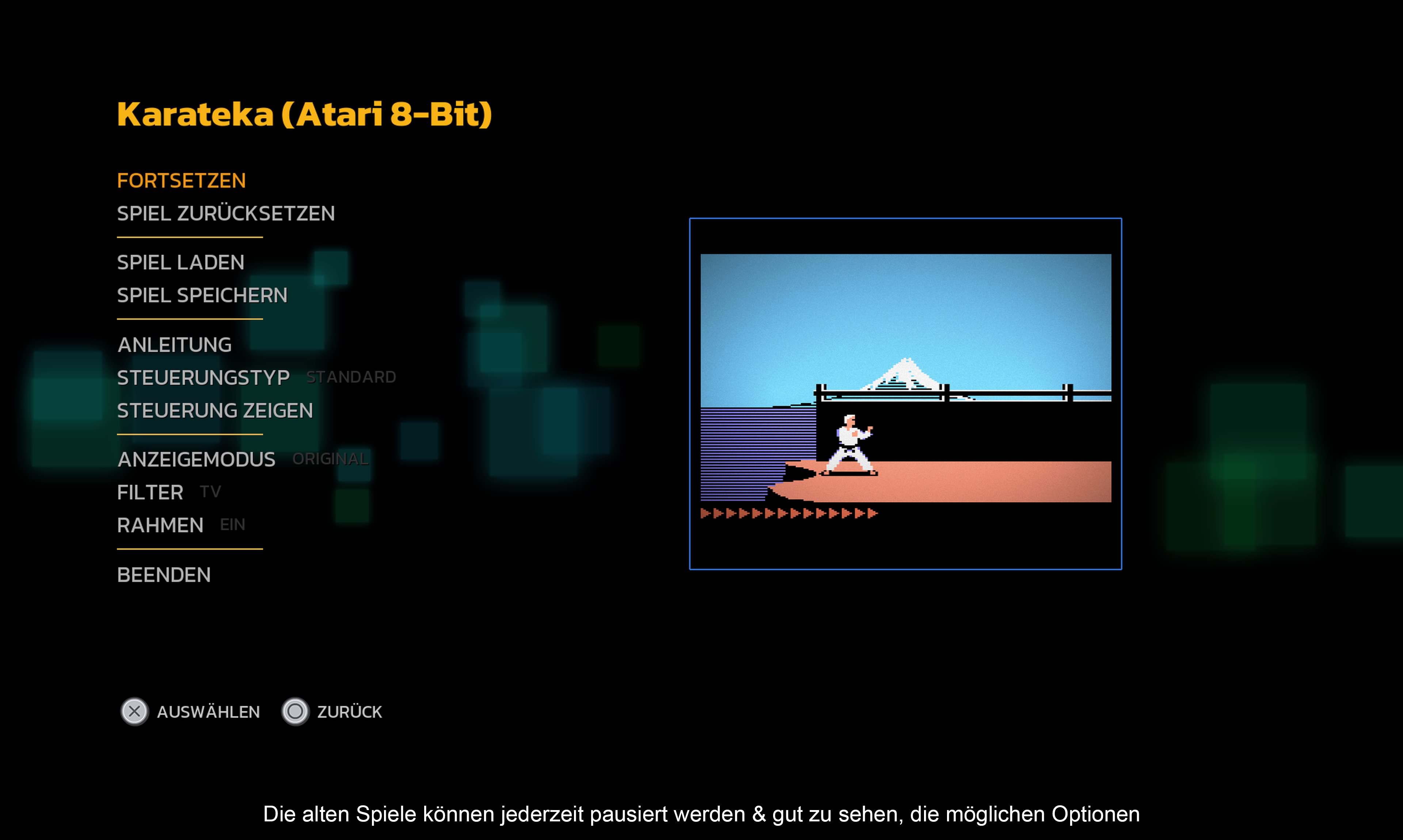 Das klassische „Karateka“ kann man in drei Versionen (Apple II, C64 und Atari 8bit) ausprobieren. Zudem gibt es noch einige Prototypen (inkl. Konzepte an denen Mechner zuvor schon tüftelte), sowie die beiden brandneuen Spiele („Karateka Remastered“ und Deathbounce: Rebounded“). Insgesamt gibt es also 14 Titel. Diese kann man entweder selbst spielen oder man schaut sich (zumindest bei den älteren Spielen) einen Spieldurchgang in Videoform an. Während des Spielens kann man die Klassiker auch jederzeit pausieren, Änderungen an den Anzeigeoptionen vornehmen, Speichern und Laden, sowie die Steuerung anpassen. Nur Cheats gibt es keine. Dafür aber das eine oder andere Easteregg: Steckt zum Beispiel mal bei der C64 Version die virtuelle Diskette mit der B-Seite rein.