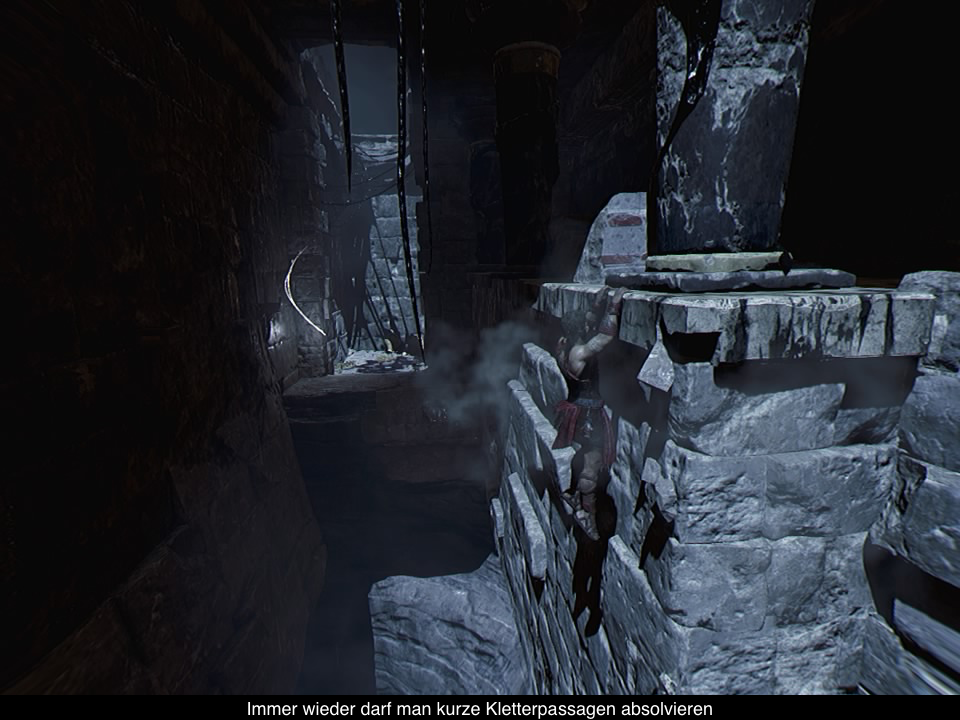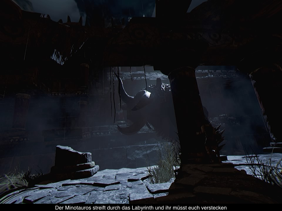 Einzig die Szenen mit dem Minotauros und anderen Gegnern sind etwas interaktiver. Vor dem Minotauros müsst ihr euch natürlich verstecken und z.B. eure Fackel löschen, da er euch ansonsten sieht und mit einem Hieb umbringen kann. Bei Gegnern kann die Fackel ebenfalls eingesetzt werden, denn damit könnt ihr die Gegner erschrecken und zurückweichen lassen, um euch etwas Luft zu verschaffen. Mit etwas Geschick steckt ihr sie in Brand und könnt sie dann mit einem gezielten Schwerthieb besiegen. Leider kommt das Kampfsystem, wie die komplette Steuerung etwas hakelig daher, aber immerhin kann man kaum im Kampf sterben. Dafür sind sonstige Abschnitte leider oft Trial & Error, weil man nicht wirklich weiß, was getan werden soll. Immerhin sind die Checkpoints fair gesetzt