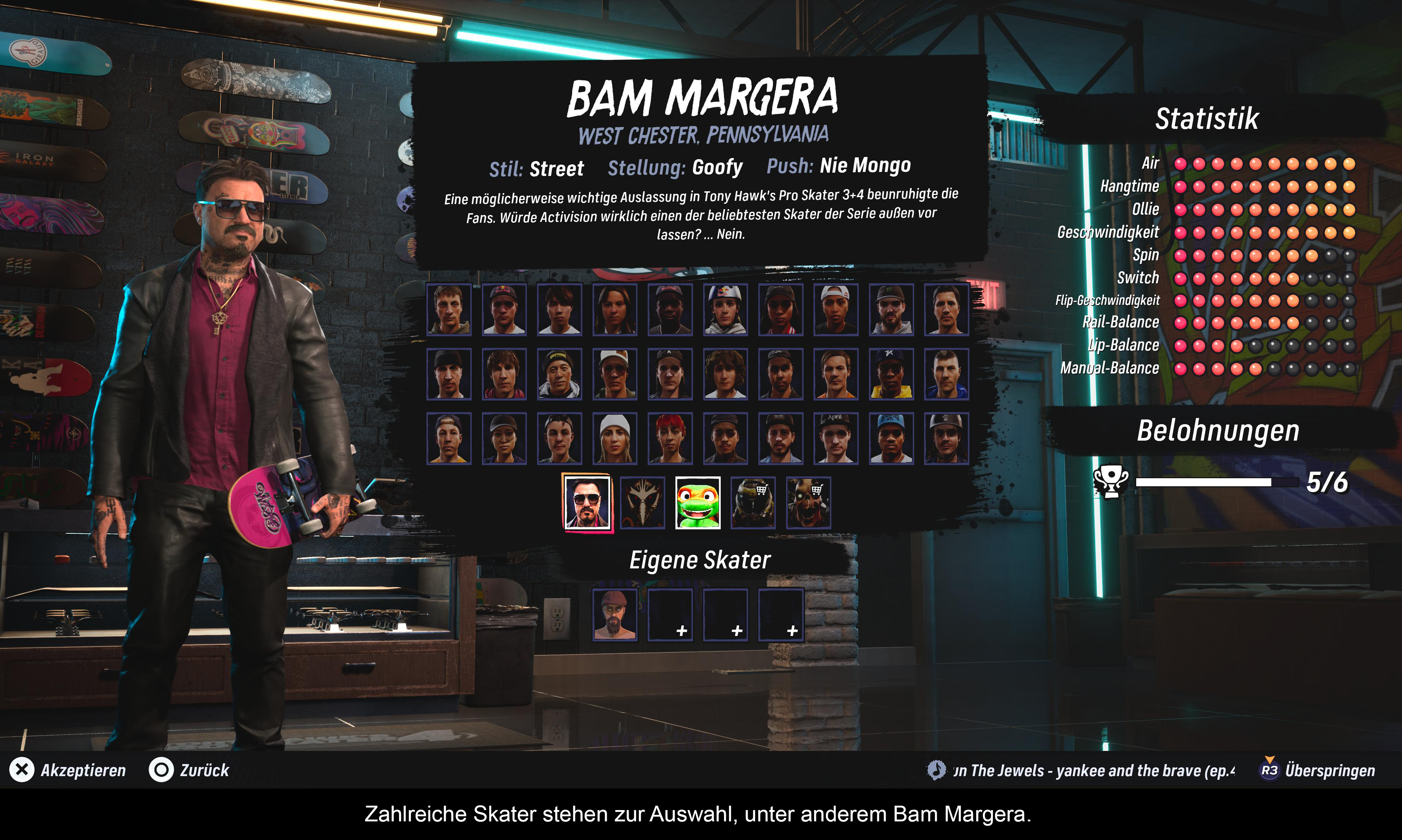 Was die Anzahl der Skater betrifft, hat sich in den letzten Jahrzehnten einiges getan. Neben den alten Hasen wie Tony Hawk und Steve Caballero kommen viele Neulinge zum Zuge, die vor allem bei den Olympischen Spielen glänzen konnten. Das war ein geiler Wettbewerb, den ich jedem nur empfehlen kann! Auch „Exoten” wie der Helmträger Andy Anderson und der Jackass-Star Bam Margera sind dabei. Letzterer ist ein kleines Highlight für alle, die die Höhen und Tiefen dieses Stars mitverfolgt haben. Es gibt drei weitere geheime Skater zu erspielen und wer die teure Special Edition kauft, darf auf den Doom Slayer und den Revenant zugreifen. Jeder dieser Skater verfügt über eigene Spezialtricks und Statuswerte. Was Kleidung und Boards betrifft, ist man hier nicht so großzügig. Abgesehen vom Titelhelden haben alle Skater nur drei Outfits, Gastcharaktere nur eines. Die Auswahl der Boards ist ebenfalls sehr begrenzt und weitere müssen erst aufwendig erspielt werden. Wer mehr Abwechslung benötigt, kann seinen eigenen Skater erstellen. Die Optionen sind jedoch sehr begrenzt. Die Mode und Bretter stammen von echten Marken und bieten nicht die ausgefallenen Kombinationen, die man sich von einem Arcade-Spiel erhofft. Ein Highlight ist daher, dass man seine Figur wie Marty McFly aussehen lassen kann.