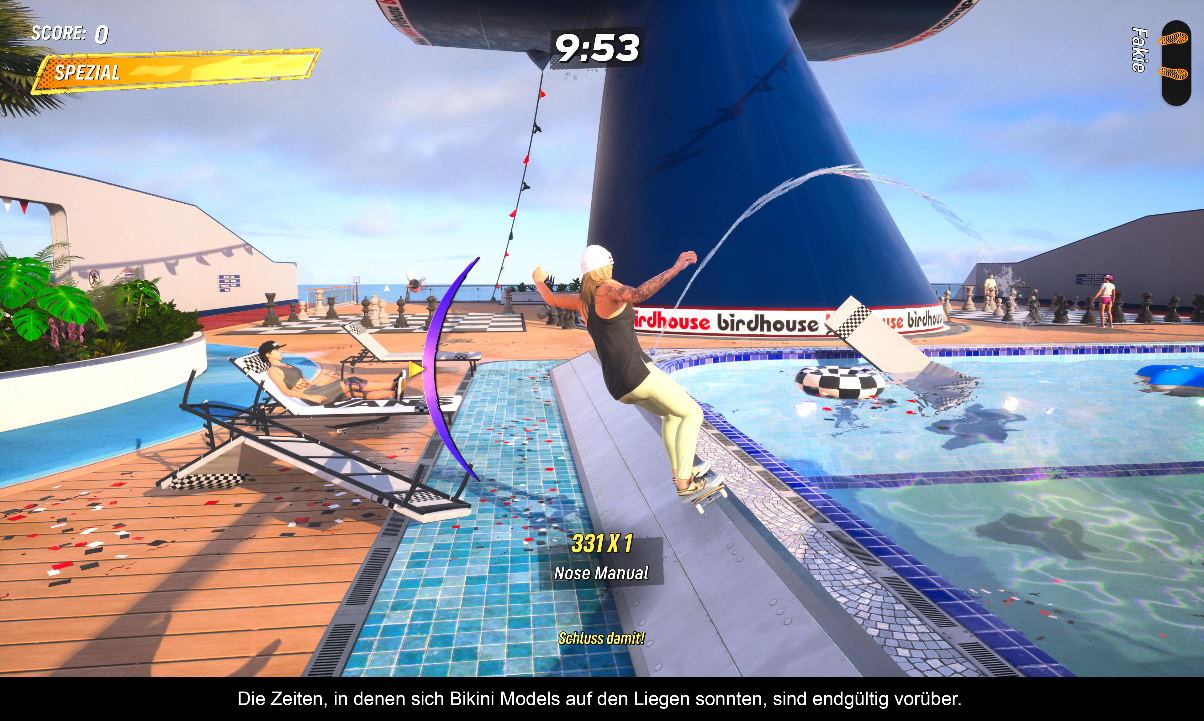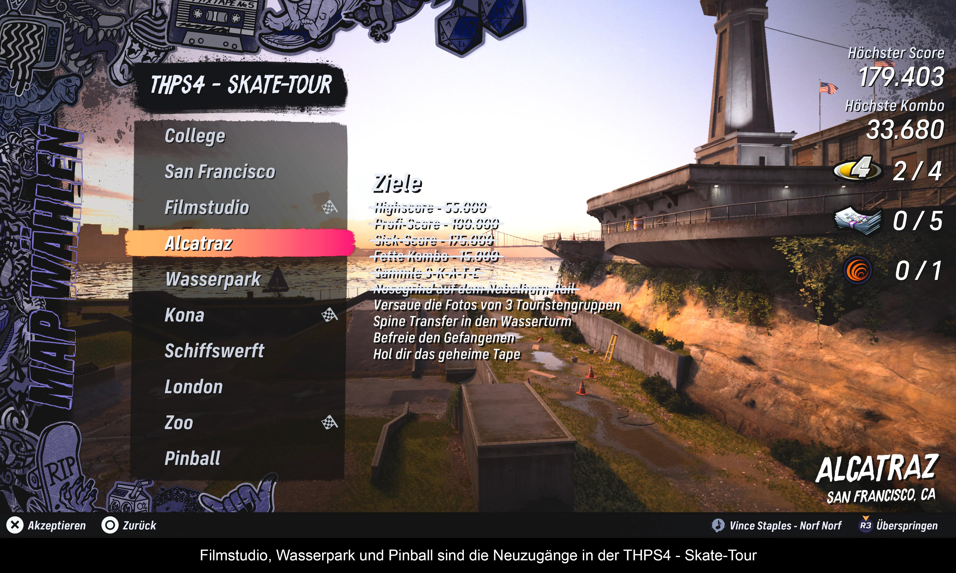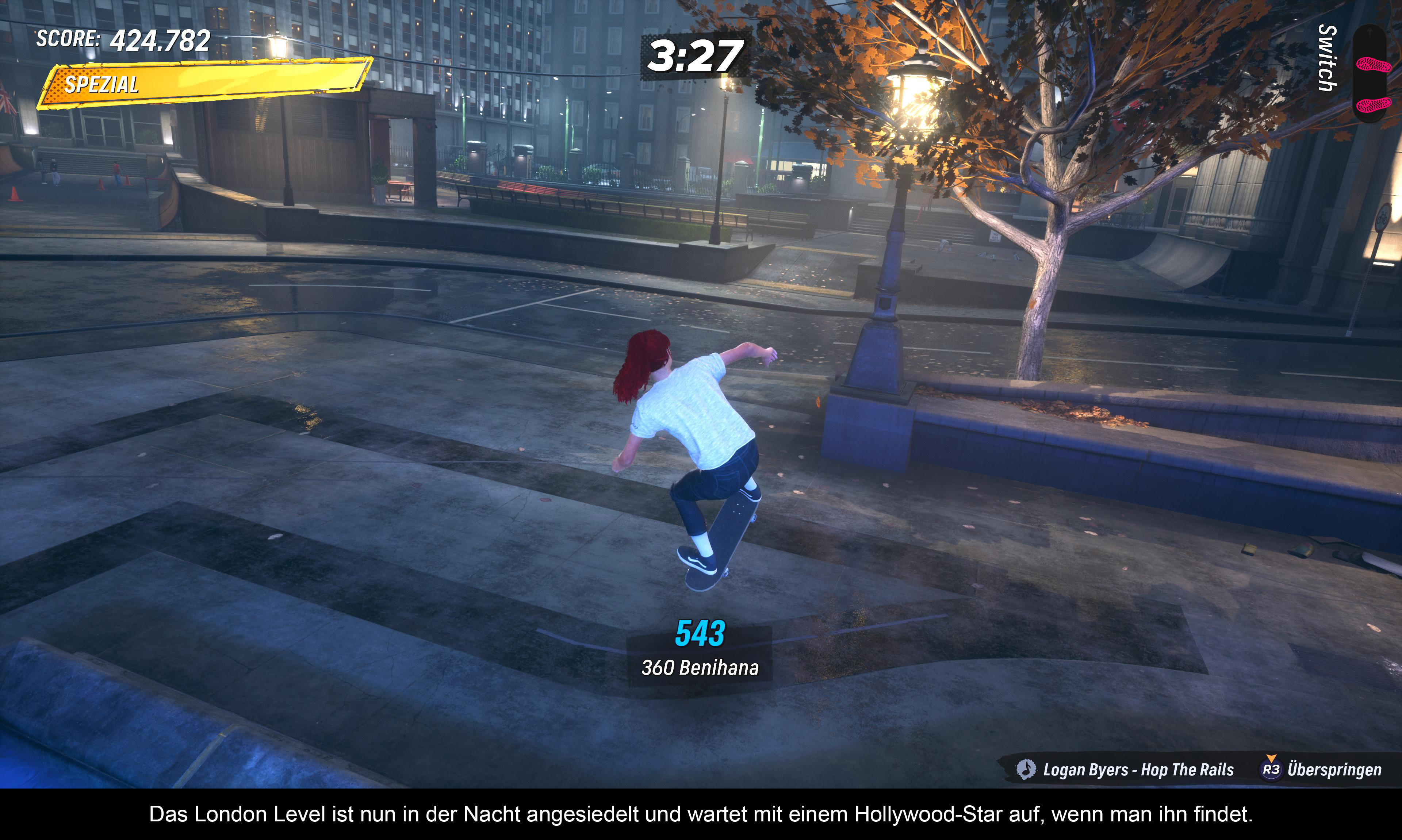 Teil 3 war der letzte klassische Teil, bevor neue Elemente eingeführt wurden. Oben läuft immer noch der Zwei-Minuten-Timer und es gilt, in dieser Zeit die entsprechenden Aufgaben zu erfüllen. Egal, ob das Knacken des Highscores, die Suche nach „SKATE” oder ein entsprechender Trick auf einer Rampe – in welcher Reihenfolge ihr die Aufgaben abarbeitet, ist egal. Am Ende des Countdowns zählt nur das Ergebnis. Teil 3 ist somit ein gelungenes Remake des PS2-Klassikers.