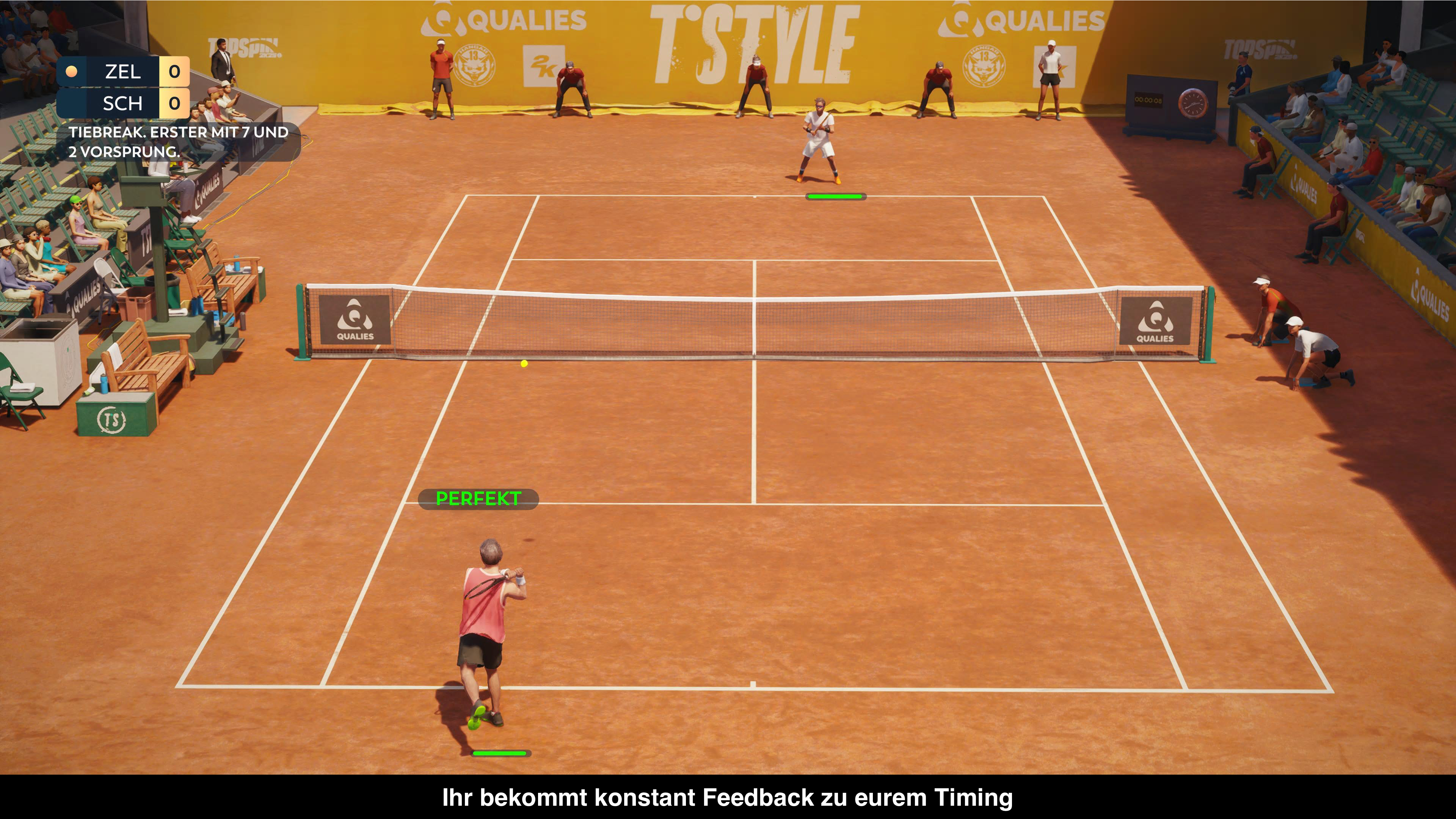 Top Spin war immer eher eine Simulation als ein Arcade-Spiel und TopSpin 2K25 führt diese Tradition weiter. So ist euer Timing, aber auch das Stellungsspiel entscheidend, um Erfolg zu haben. Dabei stehen euch flache Bälle, Top Spin Schläge, Slice Bälle, Lobs und Stopbbälle zur Verfügung, die ihr über die Aktionstasten auslösen könnt. Dabei steht jede Schlagvariante in einer kontrollierten und einer Power-Variante zur Verfügung. Die kontrollierten Schläge führt man aus, indem man die Taste kurz im richtigen Moment drückt. Diese Schläge sind zwar weniger kraftvoll, können aber genauer gespielt werden. Alternativ könnt ihr die Taste auch länger drücken und somit einen Powerschlag ausführen, der eben besonders kraftvoll ist. Um euch das Timing zu erleichtern, gibt es über dem Kopf des Spielers eine Leiste, die sich zügig füllt. Die Leiste ist zwar zu Beginn recht hilfreich, aber langfristig muss man eher in den Flow des Spiels kommen und ein Gefühl für das Timing entwickeln. Dabei kommentiert das Spiel jedes Timing und sagt euch, wie gut oder schlecht das war. Je besser das Timing ist, desto kontrollierter wird auch der Ball gespielt. Das sorgt immer wieder für interessante Ballwechsel, weil man vielleicht das Spiel beenden könnte mit einem präzisen Schlag, aber dann stimmt das Timing nicht und so wird der Gegner ins Spiel zurückgeholt.