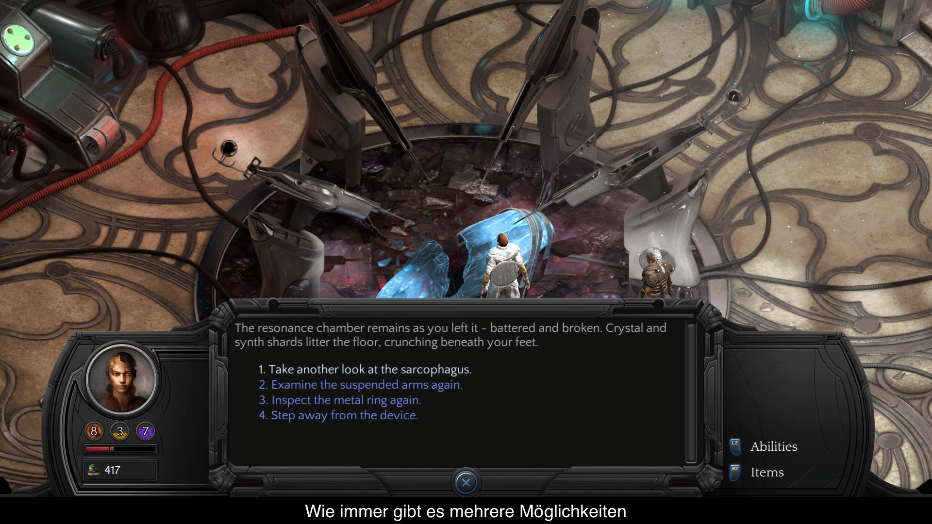 Die Regeln sind bewusst einfach gehalten, um das Geschehen in den Vordergrund zu stellen: Es gibt nur drei Klassen: Den Cypher-werfenden Nano, die kampfbetonte Gleve und den vielseitig einzusetzenden Jack. Anstatt vieler Attribute gibt es drei Pools (Kraft, Geschwindigkeit, Intellekt), die in Verbindung mit Fähigkeiten jeden Skill Check modifizieren. So wird sichergestellt, dass das Geschehen im Vordergrund steht und nicht die Regeln. Da sich „Torment: Tides of Numenera“ sehr bedeckt hält, was die Folgen des eigenen Handelns angeht, verleitet es mich dazu, wirklich den Charakter zu spielen, den ich spielen will und nicht ins Powergaming zu verfallen, um möglichst einfach durch das Spiel zu walzen.