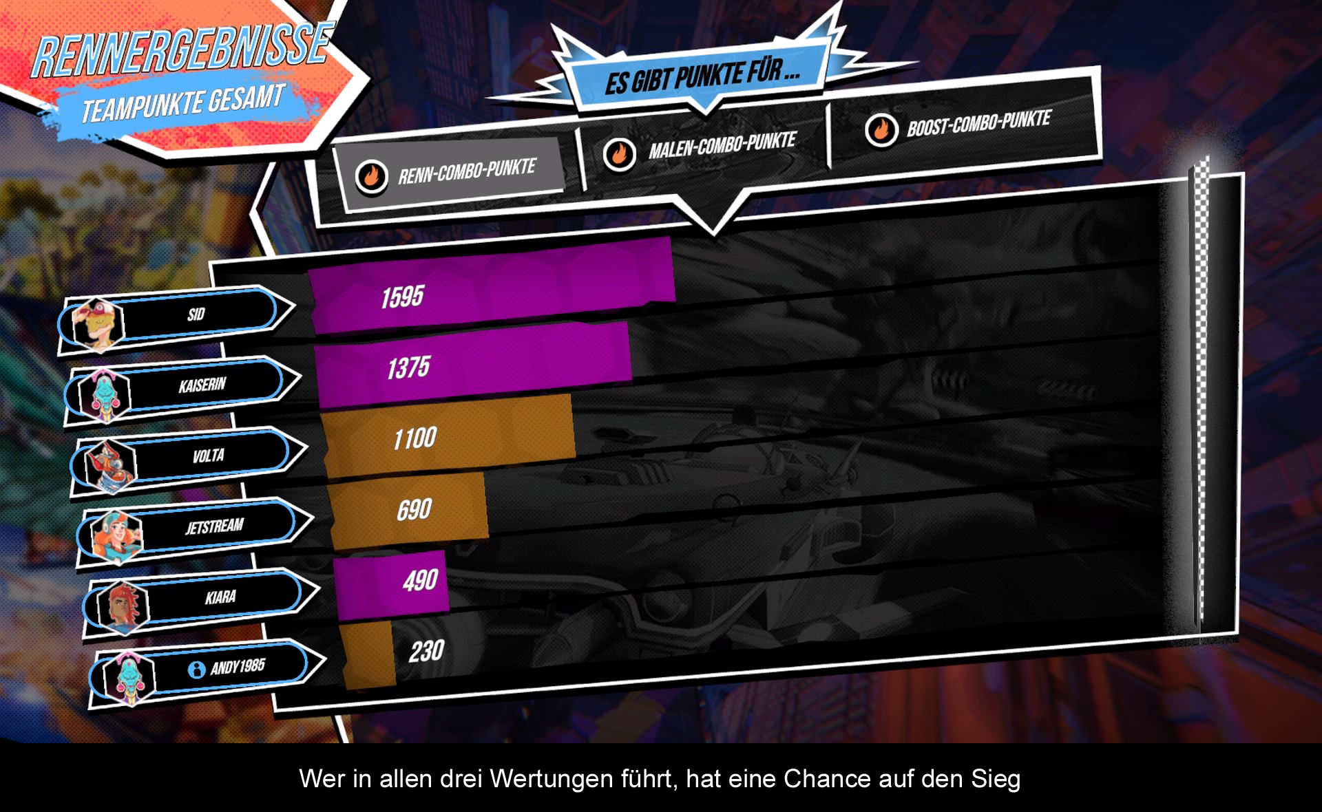 Wie bereits erwähnt, werden am Ende des Rennens alle Teampunkte zusammengezählt. Auf dem Papier klingt das einfach, aber bei der Abrechnung kann schon mal ein Viertplatzierter das Rennen nach Punkten gewinnen. Diese Vergabe ist reichlich verwirrend und trübt den Spielspaß ungemein. Es hilft auch nicht, das Gegner und Mitspieler KI mehr als dumm sind und einen oft an die Bande drängen, oder man sich ineinander verkeilt. Doch auch technisch hadert das Spiel mit vielen kleinen Problemen, wie die stotternde Framerate und einigen Clipping-Fehlern. Der Online-Modus ist verlockend, doch scheint sich niemanden in den zu verirren, weshalb bislang ziemlich tote Hose dort ist.