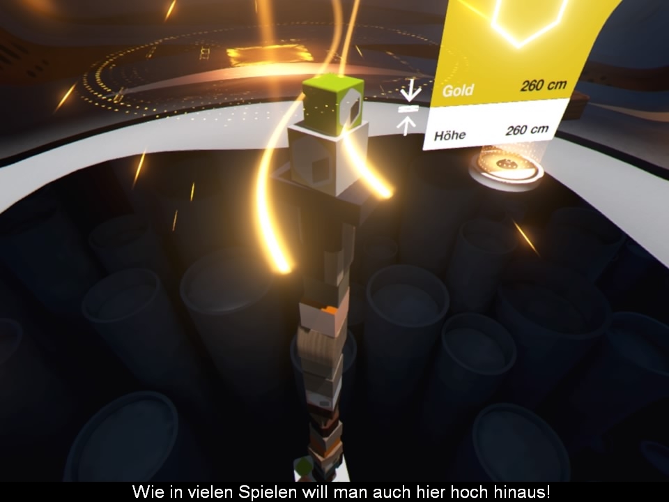 Das Grundprinzip von "Tumble VR" ist, möglichst elegant so viele Steinchen wie möglich auf einer Plattform zu platzieren. Je nach Vorgabe geht es entweder darum, stur einen Stein auf den anderen zu setzen, um möglichst hoch zu kommen oder einfach so viele Bauklötze wie möglich systematisch auf einer Plattform abzulegen. Dabei bestehen die Bauklötze nicht nur aus verschiedenen Materialien wie Plastik, Glas, Stein, Holz, Schaumstoff oder Gummi inklusive deren Eigenschaften, sondern auch aus verschiedenen Formen wie Quader, Zylinder, Pyramiden und Halbkugeln. Als wäre es nicht schon schwer genug eine ruhige Hand zu behalten, fügte man zudem noch viele verschiedene und vor allem gemeine Umwelteinflüsse hinzu. Das reicht von schrägen Plattformen, bis hin zu Erdbeben, Kanonen oder sich hin und her bewegenden Hindernissen. Neben dem Platzieren von Bausteinen, bietet "Tumble VR" aber noch allerhand weitere Aufgaben für euch. Da gibt es noch Level, wo man mittels Bombentürme gekonnt zum Einsturz bringen muss, oder ebenfalls mittels Bomben einen Ball durch ein Labyrinth befördert. Des Weiteren gibt es noch Herausforderungen, wo man Brücken baut oder ihr eure grauen Zellen in vielen Logikrätseln anstrengen müsst, wo es gilt, einen Laserstrahl mit Spiegeln durch ein Level zu lenken. "Tumble VR" bietet zudem einen Zweispielermodus, welcher von der Idee her zwar vielversprechend daherkommt, spielerisch aber eher unausgegoren daherkommt. Während der Spieler mit dem Headset gewohnt Steinchen stappelt, versucht der andere dem Türmchenbauer das Leben schwer zu machen. Leider hat der Spieler mit dem Headset fast keine Chance, den fiesen Angriffen des anderen zu entgehen.
