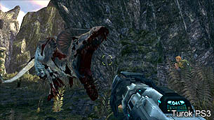 Das Spiel beginnt damit, dass die Whisky-Kompanie beim Anflug auf den Planeten abgeschossen wird. Nach einer schweren Bruchlandung gilt es sich erst einmal neu zu formieren und anschließend die Jagd auf Kane zu beginnen. Doch das ist leichter gesagt als getan, denn neben den feindlichen Soldaten müssen Turok und Co. auch noch mit allerlei Dinosauriern und anderen Biestern klar kommen. Die Steuerung (nicht konfigurierbar, gerade Mal ein Button Lay-out) leidet wieder einmal unter dem typischen – Hey, was auf der Xbox360 funktioniert, muss auch auf der PS3 funktionieren! – Syndrom. Will heißen, die Feuertasten wurden auf die R2/L2 Trigger gelegt. Besonders mit zwei Waffen im Anschlag gestaltet es sich schwierig, das Pad ordentlich zu halten und auch noch zu treffen. Dazu gesellt sich noch der Fakt, das die Waffen beim Dauerfeuer verziehen! Mit dem Messer verhält es sich nur wenig anders, nicht immer reagieren die Triggertasten auf die Eingabe und verhageln somit dem Spieler ab und an mal einen 1-Hit Dinokill. Die Viecher erledigt man nämlich am Besten mit diesem Nahkampfwerkzeug – denn ballistische Waffen haben so gut wie keine Wirkung auf die Echsen. Bei menschlichen Gegnern sollte man zwar mit Pistolen / Gewehren oder dem Bogen vorgehen, aber auch diese kann man mit einem beherzten Stealth-Kill um die Ecke bringen. Logischerweise fließt dabei kein Blut, da diese voll gepanzert sind. Diese Panzerung führt übrigens auch dazu, das eigentlich jeder Gegner gleich aussieht und man muss schon dreimal hinschauen, um zu erkennen, ob der Scherge eine Maschinenpistole trägt, oder doch nur eine Schrotflinte.