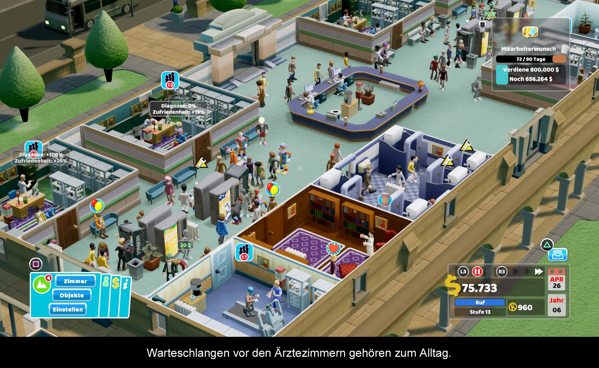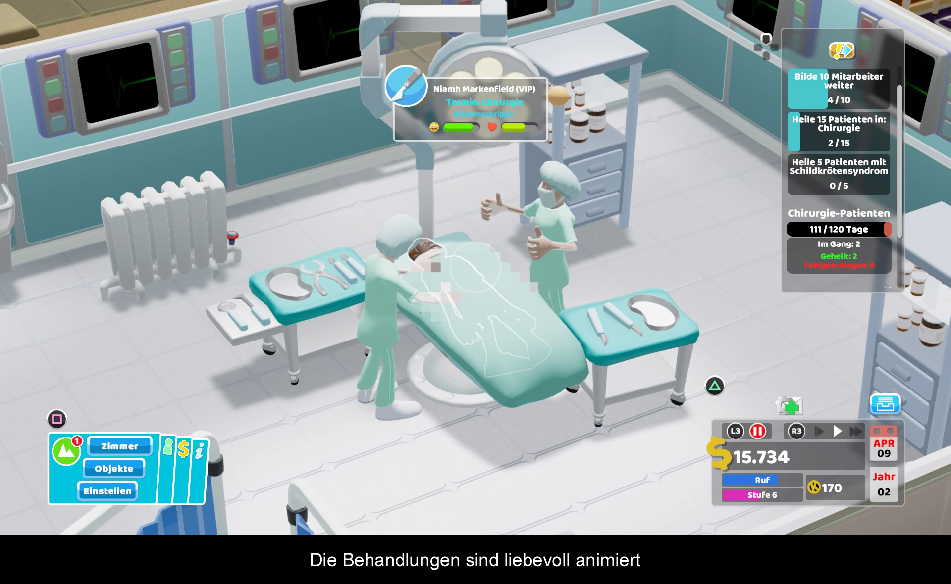 Grundlegend kann man die Steuerung als sehr gut gelungen bezeichnen. Der Controller ist nicht überbelegt und jede Taste hat seinen Zweck. Da man auf unnötige Doppelbelegungen verzichtet hat, wurde das Menü dementsprechend aufgebaut. Mit Viereck erscheint das Hauptmenü, in dem man Räume plant, sein Personal verwaltet und die Zufriedenheit der Patienten überprüft. Die Texte sind lesbar und die Sortierfunktion erfüllt ihren Zweck. Für das Personal klappt das gut, doch für Patienten und den Behandlungskosten muss man schon etwas scrollen. Hier verliert man schnell den Überblick. Auch bei der Raumplanung schlägt das System die richtige Größe und die notwendige Einrichtung vor. Ohne viele Klicks hat man seinen Behandlungsraum gebaut. Will man ihn im Detail dekorieren muss mit der Steuerung etwas kämpfen. Jedes Objekt braucht einen gewissen Platz und die Möglichkeit, dass es vom Personal erreicht wird. Hier hat das System Schwächen, da die Controller-Steuerung sehr „magnetisch“ ist und die Objekte sich nicht in beliebige Positionen bringen lassen. So kann man gewisse Räume nicht optimal ausnutzen.