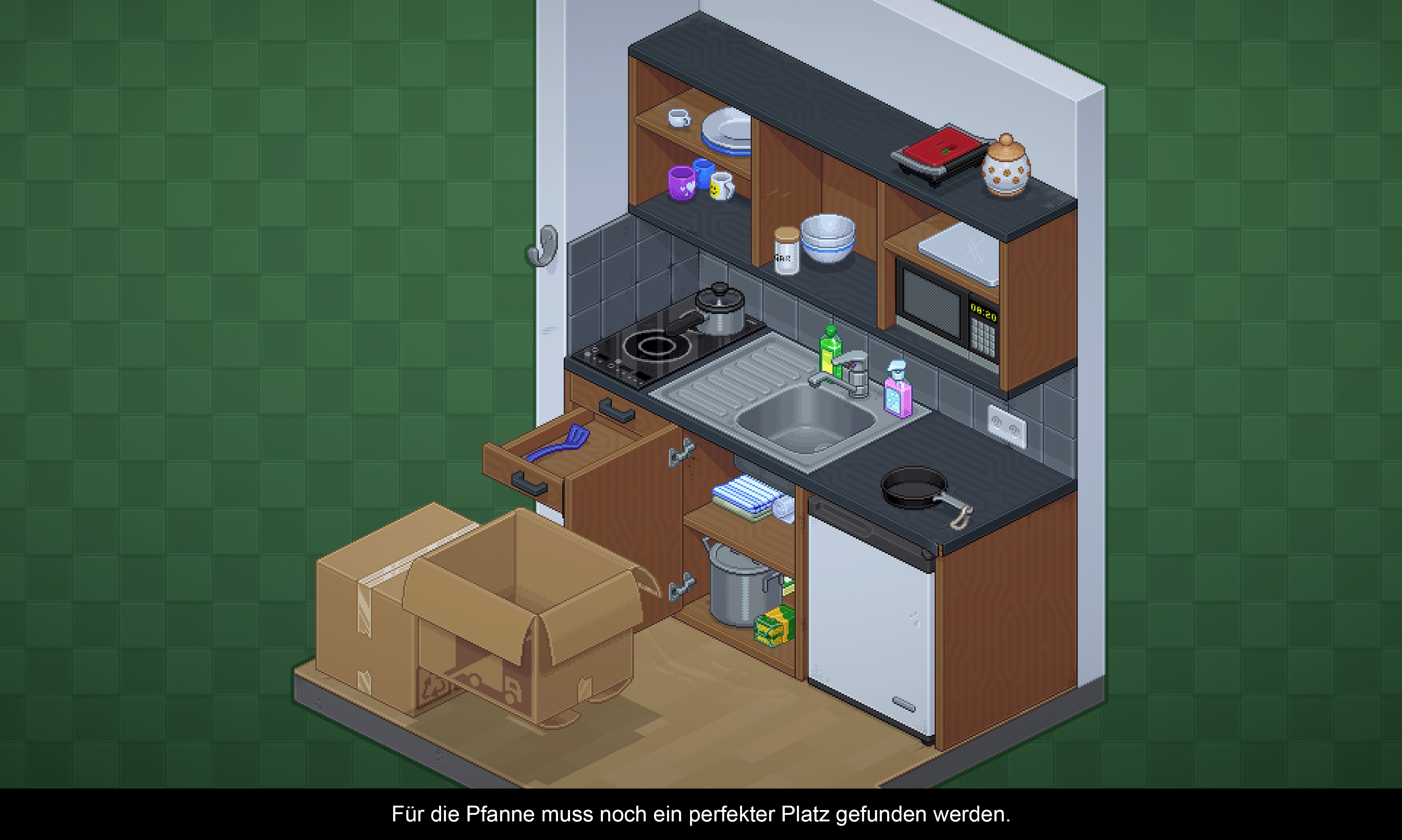 Hinsichtlich des Gameplays präsentiert sich dieses Spiel ebenfalls sehr minimal. Im Grunde muss man nur die Objekte, die man aus den Kartons entnimmt, an den richtigen Ort setzen. Wurde die letzte Kiste ausgepackt und alles steht an seinem Platz, dann ist das Level beendet. Die Herausforderungen werden im Laufe der Zeit etwas komplexer. So kommen später auch Bad, Küche und Wohnzimmer dazu. Das Prinzip bleibt jedoch das Gleiche, nur das in den Kartons für die Küchenutensilien mal eine WC-Bürste reingerutscht ist. Diese wandert natürlich ins Bad.