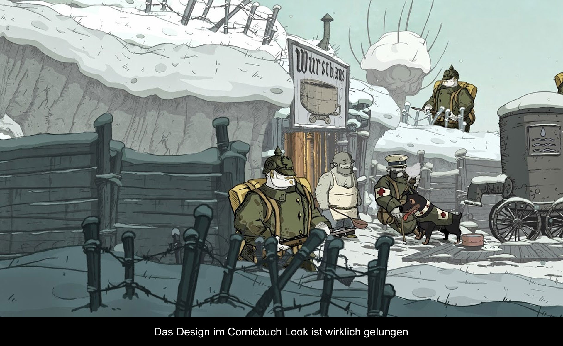 „Valiant Hearts: The Great War“ ist in vielerlei Hinsicht ein etwas anderes Kriegsspiel. Das Gameplay kommt größtenteils ohne Waffen aus. Hier und da ist es zwar notwendig einen Geschützturm zu bedienen, um feindliche Stellungen auszuheben, aber das war es auch schon. Im Vordergrund stehen hier Rätsel. Ein Großteil dieser befasst sich mit dem Suchen spezieller Objekte, welche in der Umgebung versteckt sind. So braucht Anna einen Schal, der auf einen Baum hängt. Um an Ihn heranzukommen, gilt es eine Säge zu organisieren usw. Die meisten dieser Aufgaben basieren auf einfachen Physik-Rätseln, doch hin und wieder stößt man auch auf klassische Logikrätsel, wo einmal der Durchfluss von Wasser umgelenkt wird, oder ein bestimmtes Bauteil geprägt werden muss. Diese sind aber eher selten. Einen weiteren Großteil der Aufgaben löst ihr mit eurem treuen Hundebegleiter, der versteckte Objekte ausgraben kann, Menschen aus unerreichbaren Gefahrenzonen zerrt, oder durch kleine Löcher passt. Die Mischung der Rätsel ist durchaus gelungen. Man trifft selten auf zwei hintereinander folgende gleiche „Kopfnüsse“. Auch die Präsentation ist immer unterschiedlich. So erscheint manches Rätsel plötzlich in einem ganz anderen Licht.