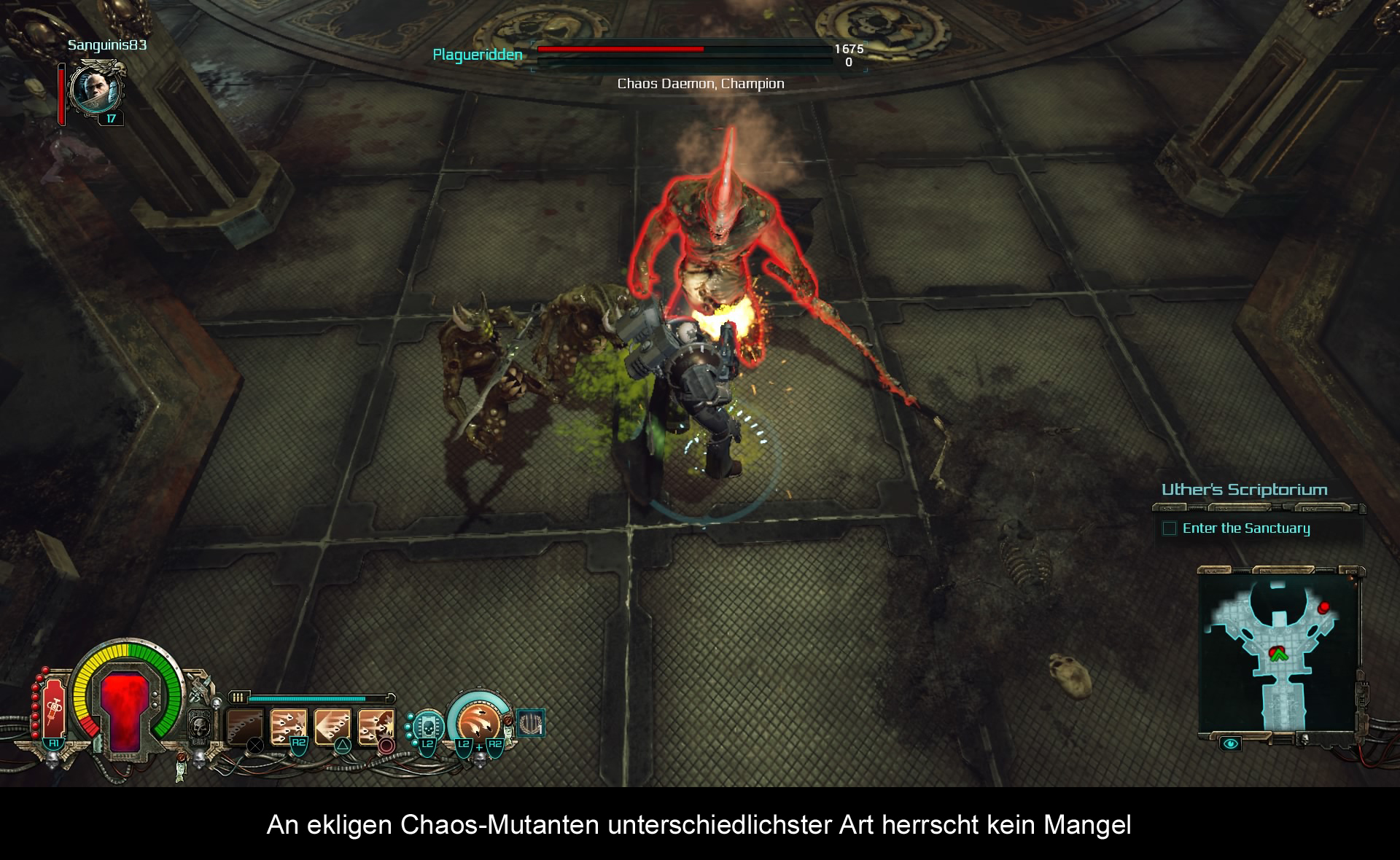 Ich spiele den namensgebenden Inquisitor des Imperiums, einen Agenten mit fast absoluter Macht, der sehr weitreichende Befugnisse und Freiheiten besitzt. Im Caligari-Sektor haben Warp-Stürme ein sehr altes Schiff, die „Martyr“, ausgespuckt, auf dem komische Dinge vor sich gehen und mächtige Artefakte zu finden sein sollen. Und ich werde dort hingeschickt, um die Sache zu untersuchen. Nach der unvermeidlichen Bruchlandung meines Landeshuttles wird der erste Ausflug auf die Martyr für das Tutorial benutzt. Hier fällt gleich auf, dass das Spiel es etwas anders machen möchte als Diablo & Co., um sich ein wenig abzuheben: Meine benutzbaren Skills sind nicht an meine Charakterklasse gebunden (von denen es drei Stück gibt: die Tank-Klasse heißt Crusader, der magisch begabte Psyker und der schleichende Schurke nennt sich Assassine), sondern an die von mir verwendete Ausrüstung. Waffen und Ausrüstung verfügen über ein bis vier Skills, die zur Waffe passende Wirkungen haben. So verfügt ein schwerer Bolter über eine immer schneller werdende Salve und auch über Granaten, ein Plasmagewehr hingegen über Einzelschüsse und einen konzentrierten Überladungsschuss. Ganz anders hingegen spielt sich der Psyker, der nur bedingt auf normale Ausrüstung setzt, sondern seine Psyker-Kräfte unabhängig entwickelt und einsetzen kann. Während ich bei normalen Waffen nur auf Munition und Überhitzung achten muss, darf der Psyker nicht zu achtlos mit seinen Kräften umgehen, da er sonst den Mächten des Warps (und damit des Chaos) ausgesetzt ist. Das ist eine schicke Mechanik, um die teils sehr mächtigen Sprüche zu balancieren.